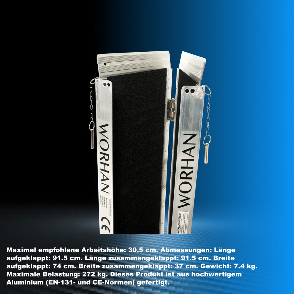 Maximal empfohlene Arbeitshöhe: 30.5cm., Abmessungen: Länge aufgeklappt: 91.5cm., Länge zusammengeklappt: 91.5cm., Breite aufgeklappt: 74cm., Breite zusammengeklappt: 37cm., Gewicht: 7.5kg., Maximale Belastung: 300kg., Dieses Produkt ist aus hochwertigem Aluminium (EN-131- und CE-Normen) gefertigt.