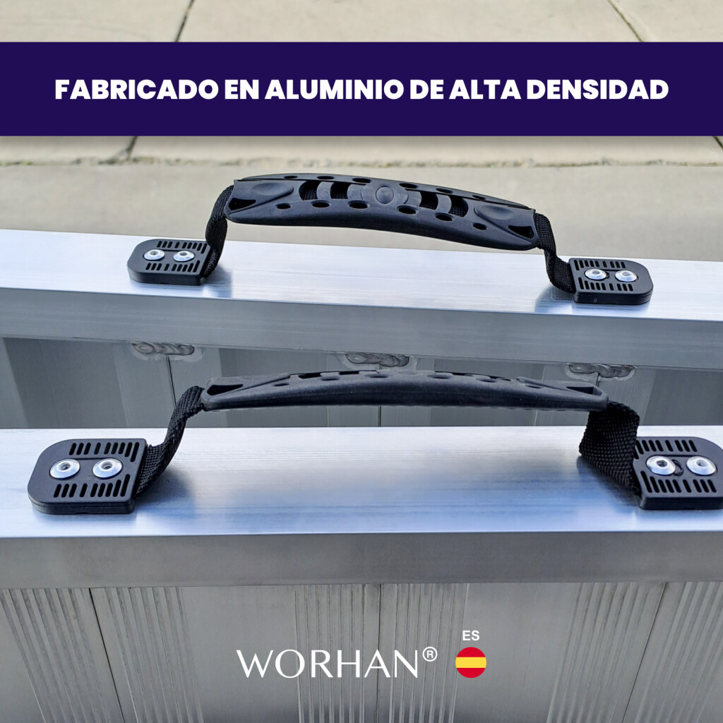 Max. empfohlene Arbeitshöhe - 56cm., Dieses Produkt ist aus hochwertigem Aluminium (EN-131- und CE-Normen) hergestellt., Maximale Belastbarkeit: 400kg., Abmessungen: Länge aufgeklappt: 205cm., Länge zusammengeklappt: 108cm., Breite: 78cm., Gewicht: 24kg., Abmessungen zusammengeklappt: 108cm x 14cm x 78cm., Dies ist ein unverzichtbares Produkt, das Rückenverletzungen vorbeugt und das Be- und Entladen beschleunigt. Warum lohnt es sich, die von uns hergestellten Waren zu kaufen: Bei der Herstellung verwenden wir Materialien mit größerer Dicke, um die Festigkeit zu erhöhen und die Stabilität zu erhöhen. Wir haben uns spezialisiert und verfügen über langjährige Erfahrung in der Herstellung von Leitern und Rampen. Als deutscher Markenhersteller stehen wir im langfristigen Kontext hinter unseren Produkten. Aluminium von höchster Qualität gewährleistet die Robustheit und Langlebigkeit unserer Produkte.