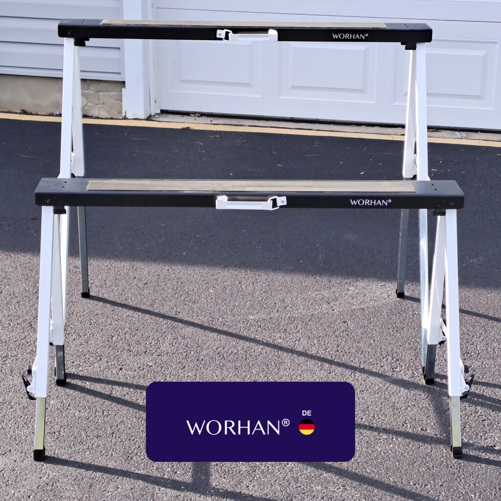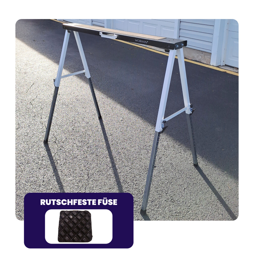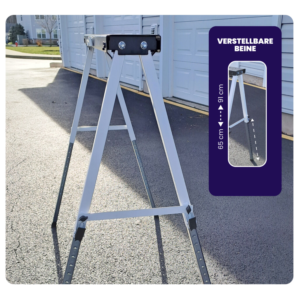 Abmessungen: 109cm x 12cm x 7cm. Gewicht 7kg (14kg Paar). Tragkraft 150kg (300kg pro Paar). Verstellung der Arbeitshöhe (65cm bis 91cm) dank den schnell verstellbaren Füßen Deutsche Marke., Außergewöhnliche Kundenbetreuung. Einfache Einrichtung., Rutschfeste Auflagefläche sorgt für sicheres Arbeiten. Klappbarer Arbeitsbock mit integriertem Handgriff., Materialien: pulverbeschichteter und verzinkter Edelstahl.