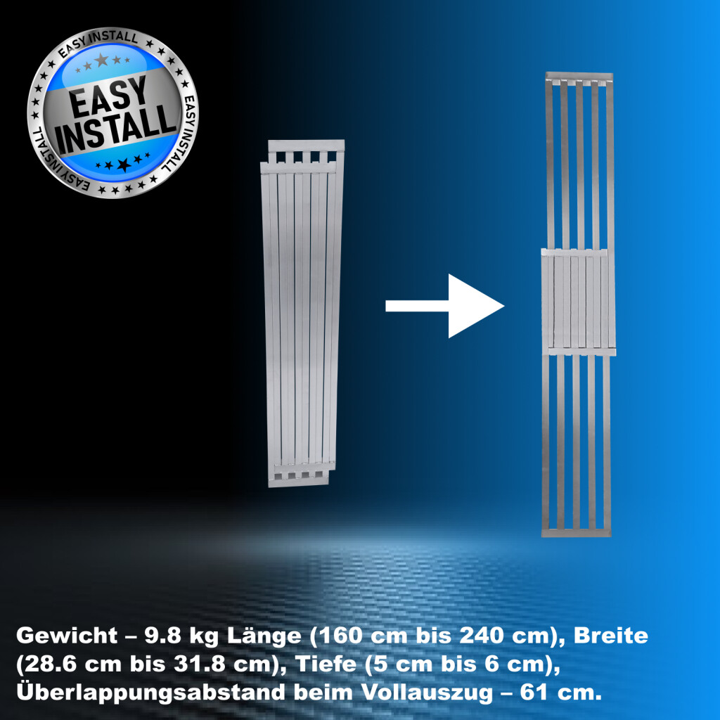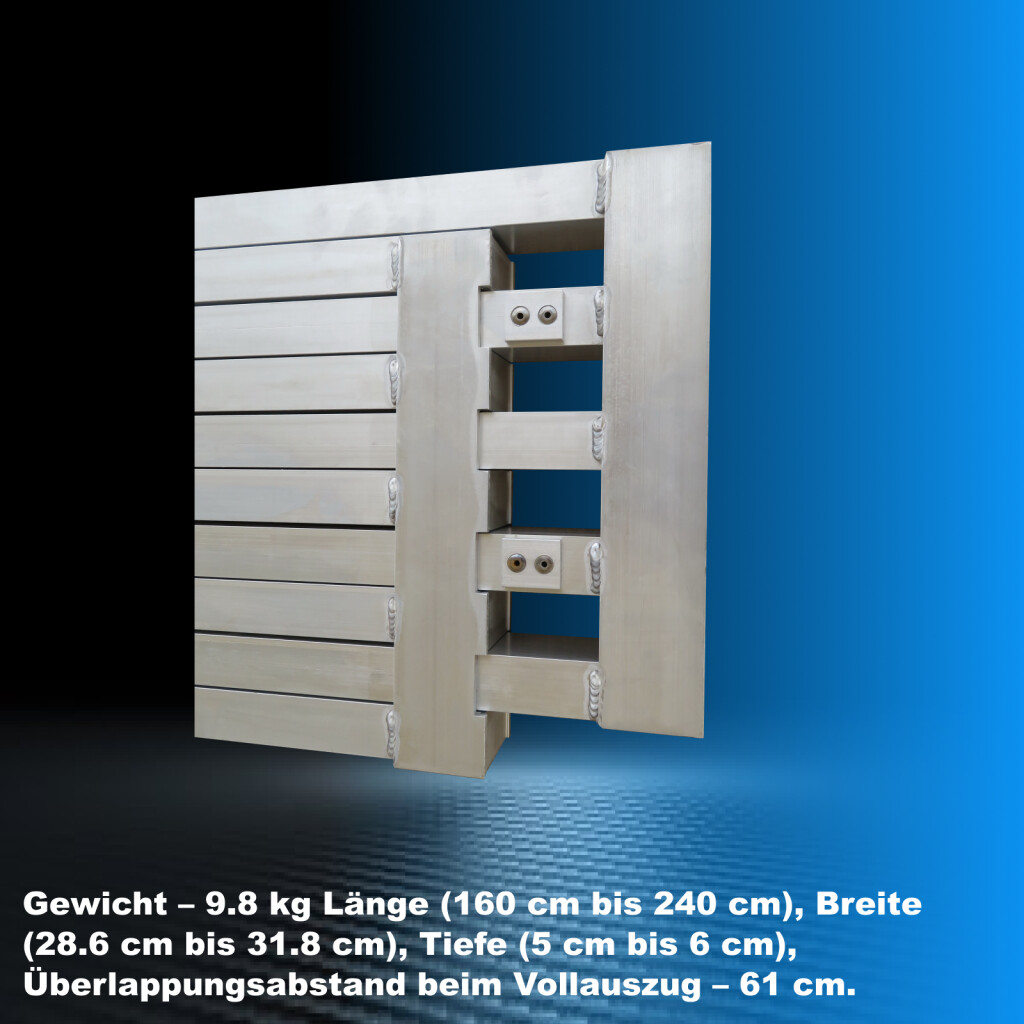 Das Produkt ist aus hochwertigem Aluminium nach EN- und CE-Normen gefertigt. Ineinandergreifendes Aluminiumprofildesign zur Unterstützung eines Gewichts von bis zu 300 kg !!! Mit 3 strapazierfähigen Griffen und einer gravierten, rutschfesten Oberfläche für verbesserten Halt ausgestattet. Gewicht – 9,8 kg, Mindestlänge (zusammengeklappt) – 160 cm, Höchstlänge (ausgefahren) – 240 cm, Mindestbreite – 28,6 cm, Höchstbreite – 31,8 cm, Mindestdicke – 5 cm, Höchstdicke – 6 cm, Überlappungsabstand, wenn vollständig ausgezogen - 61 cm. (laut beigefügtem Bild mit Maßen DEUTSCHE MARKE. AUSSERGEWÖHNLICHER KUNDENSERVICE. Superschneller Einbau. Möglichkeit, die Rampe in jeder Länge zwischen den Mindest- und Höchstlängenwerten einzusetzen und zu verwenden. Integrierte Maximallängenanschläge aus Aluminium. Warum Sie die von uns hergestellten Produkte kaufen sollten: Bei der Herstellung verwenden wir dickere Materialien für mehr Festigkeit und erhöhte Stabilität. Wir sind spezialisiert und verfügen über langjährige Erfahrung in der Herstellung von Leitern und Rampen. Als deutsches Markenunternehmen stehen wir dahinter unsere Produkte langfristig Das hochwertigste Aluminium garantiert die Robustheit und Langlebigkeit unserer Produkte.