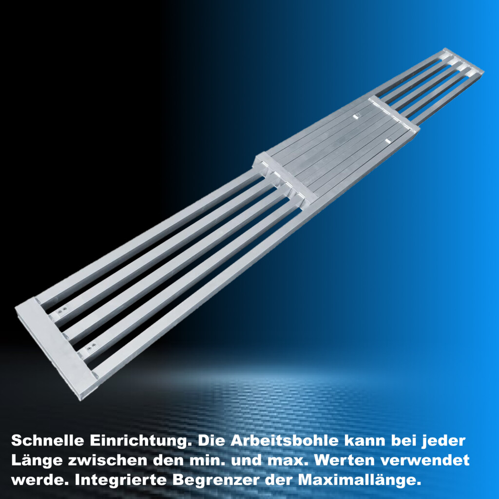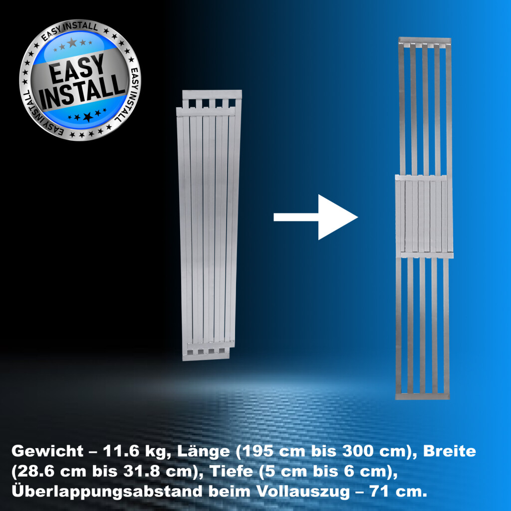 Das Produkt ist aus hochwertigem Aluminium nach EN- und CE-Normen gefertigt. Ineinandergreifendes Aluminiumprofildesign zur Unterstützung eines Gewichts von bis zu 300 kg !!! Mit 3 strapazierfähigen Griffen und einer gravierten, rutschfesten Oberfläche für verbesserten Halt ausgestattet. Gewicht – 11,6 kg, Mindestlänge (zusammengeklappt) – 195 cm, Höchstlänge (ausgezogen) – 300 cm, Mindestbreite – 28,6 cm, Höchstbreite – 31,8 cm, Mindestdicke – 5 cm, Höchstdicke – 6 cm, Überlappungsabstand bei vollständiger Verlängerung - 71 cm. (gemäß beigefügtem Bild mit Maßen) DEUTSCHE MARKE. AUSSERGEWÖHNLICHER KUNDENSERVICE. Superschneller Einbau. Möglichkeit, die Rampe in jeder Länge zwischen den Mindest- und Höchstlängenwerten einzusetzen und zu verwenden. Integrierte Maximallängenanschläge aus Aluminium. Warum Sie die von uns hergestellten Produkte kaufen sollten: Bei der Herstellung verwenden wir dickere Materialien für mehr Festigkeit und erhöhte Stabilität. Wir sind spezialisiert und verfügen über langjährige Erfahrung in der Herstellung von Leitern und Rampen. Als deutsches Markenunternehmen stehen wir dahinter unsere Produkte langfristig Das hochwertigste Aluminium garantiert die Robustheit und Langlebigkeit unserer Produkte.