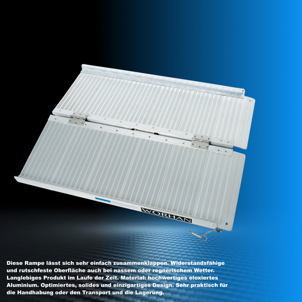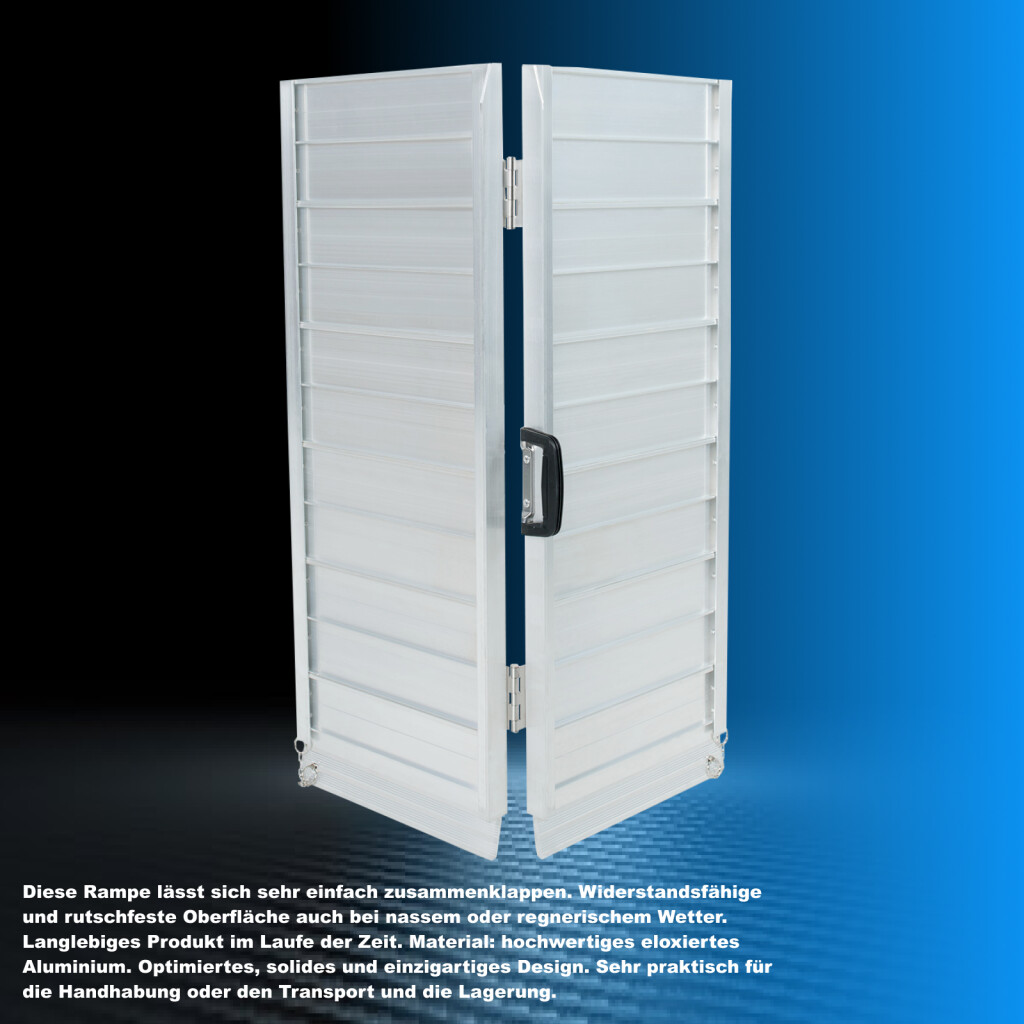 Diese Rampe lässt sich sehr einfach zusammenklappen., Widerstandsfähige und rutschfeste Oberfläche auch bei nassem oder regnerischem Wetter., Langlebiges Produkt im Laufe der Zeit., Material: hochwertiges eloxiertes Aluminium., Optimiertes, solides und einzigartiges Design., Sehr praktisch für die Handhabung oder den Transport und die Lagerung.