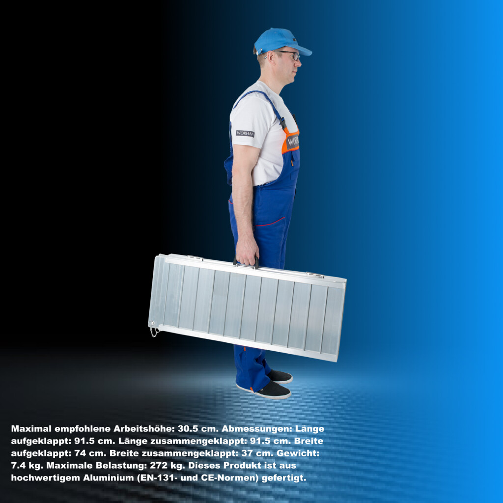 Maximal empfohlene Arbeitshöhe: 30.5cm., Abmessungen: Länge aufgeklappt: 91.5cm., Länge zusammengeklappt: 91.5cm., Breite aufgeklappt: 74cm., Breite zusammengeklappt: 37cm., Gewicht: 7.4kg., Maximale Belastung: 300kg., Dieses Produkt ist aus hochwertigem Aluminium (EN-131- und CE-Normen) gefertigt.