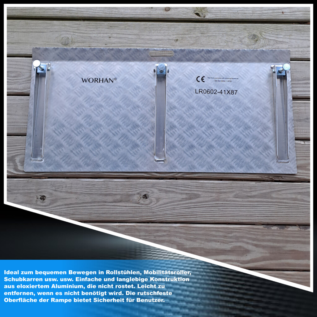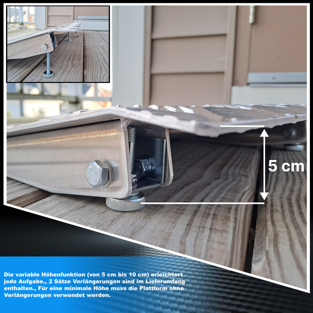 Diese Rampe erleichtert das Überqueren von Hindernissen wie: hohe Schwellen, Drähte, Rohre und andere Stellen, die die praktische Bewegung von Personen oder Ladung verhindern. Die variable Höhenfunktion (von 5cm bis 10cm) erleichtert jede Aufgabe. Hergestellt nach EN-131 und CE-Normen Technische Eigenschaften: Größe: 87cm (Breite) x 41cm (Länge), Gewicht 4.6kg, Maximale Tragfähigkeit: 300 kg, entworfen, um Höhenhindernisse (von 5cm bis 10cm) zu überwinden. Variable Höhenfunktion. Die Höhe ist in Schritten von 1mm . einstellbar Es ist keine Montage erforderlich. Ideal, um sich bequem in Rollstühlen, Rollern, Schubkarren usw. fortzubewegen. Einfache und langlebige Konstruktion aus eloxiertem Aluminium, die nicht rostet. Bei Bedarf leicht zu entfernen. Die rutschfeste Oberfläche der Rampe bietet Sicherheit für die Benutzer.