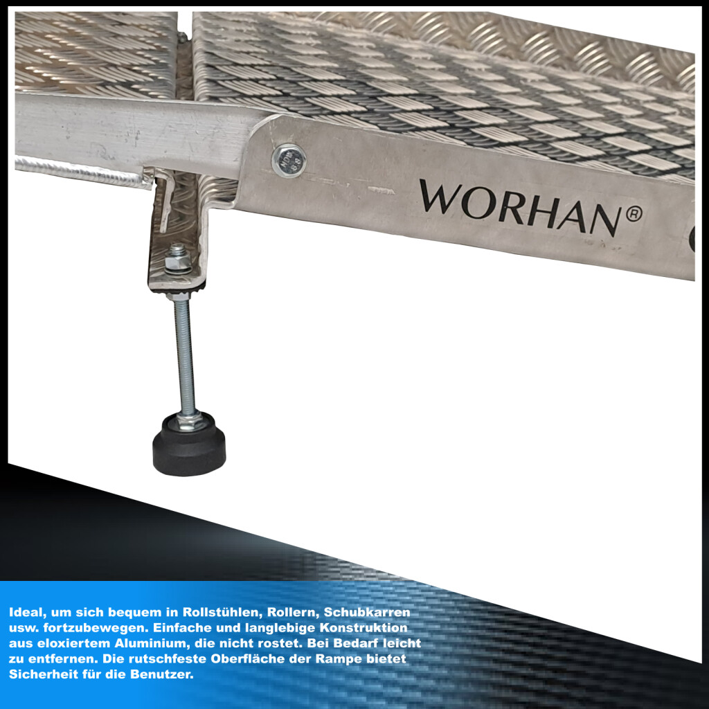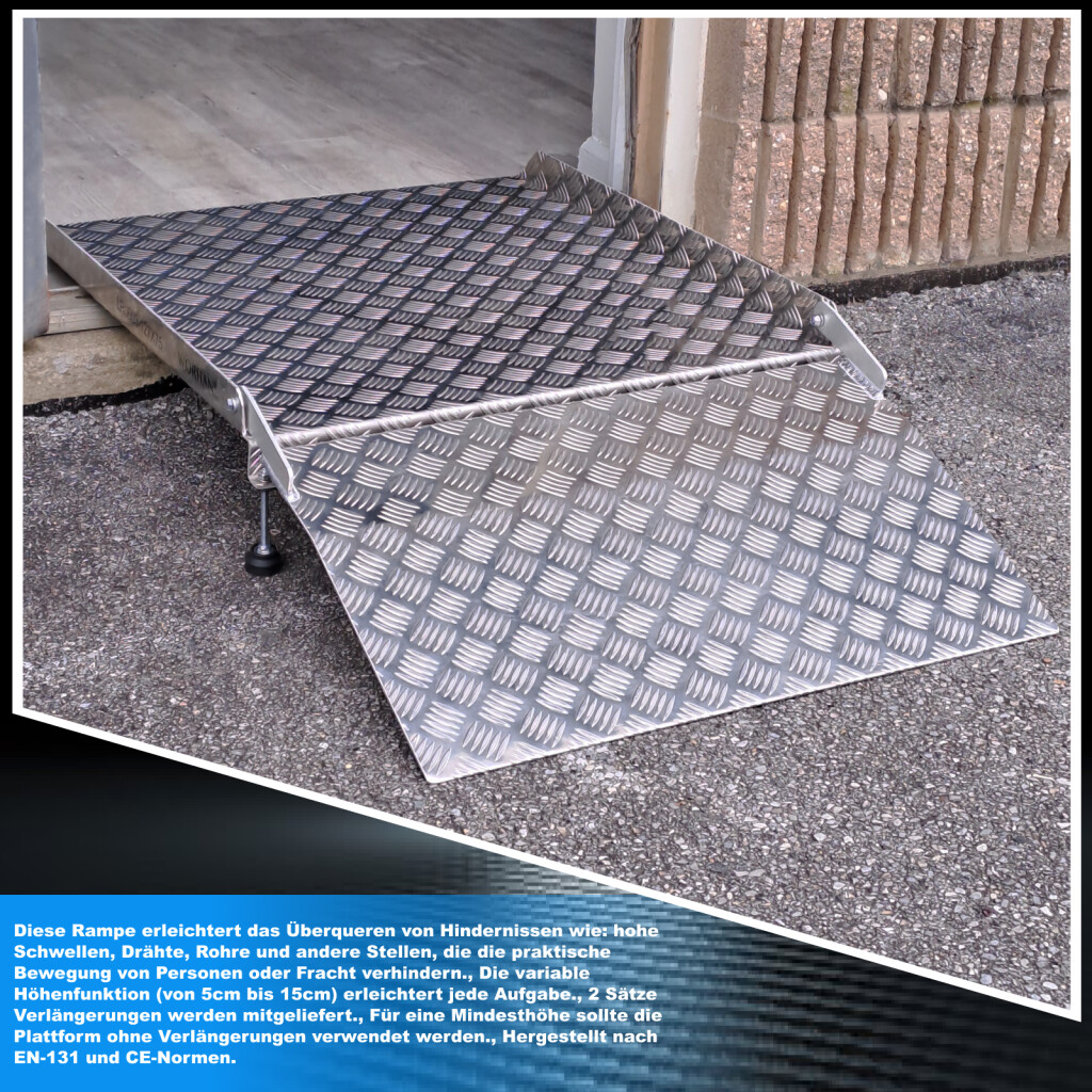 Diese Rampe erleichtert das Überqueren von Hindernissen wie: hohe Schwellen, Drähte, Rohre und andere Stellen, die die praktische Bewegung von Personen oder Fracht verhindern., Die variable Höhenfunktion (von 5cm bis 15cm) erleichtert jede Aufgabe., 2 Sätze Verlängerungen werden mitgeliefert., Für eine Mindesthöhe sollte die Plattform ohne Verlängerungen verwendet werden., Hergestellt nach EN-131 und CE-Normen Technische Daten: 75cm (Breite) x 127cm (Länge)., Gewicht 12.6kg., Maximale Tragfähigkeit: 300kg., entworfen, um Höhenhindernisse (von 5cm bis 15cm) zu überwinden., Variable Höhenfunktion., Höhe ist in Schritten von 1 mm einstellbar Es ist keine Montage erforderlich. Ideal, um sich bequem in Rollstühlen, Rollern, Schubkarren usw. fortzubewegen. Einfache und langlebige Konstruktion aus eloxiertem Aluminium, die nicht rostet. Bei Bedarf leicht zu entfernen. Die rutschfeste Oberfläche der Rampe bietet Sicherheit für die Benutzer.