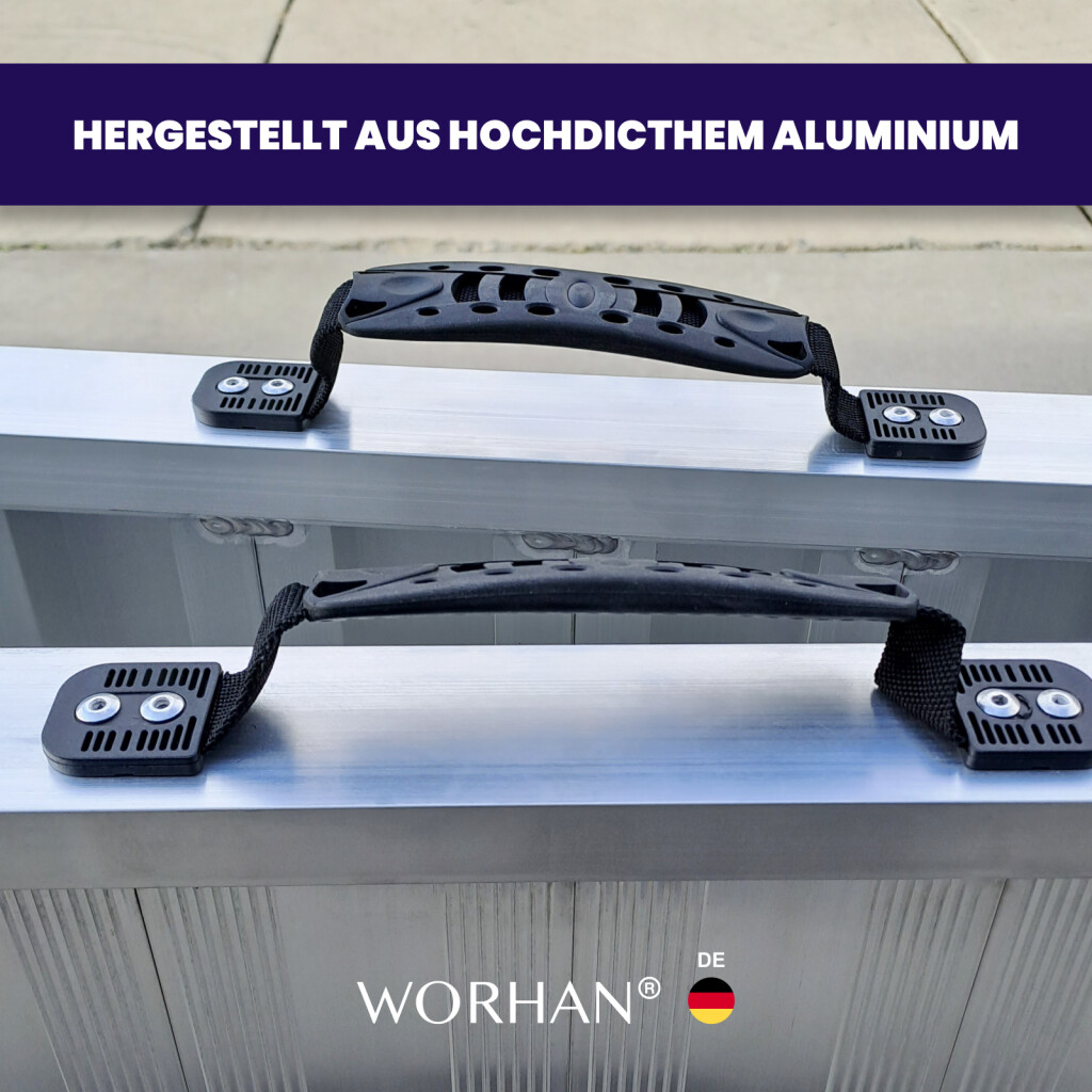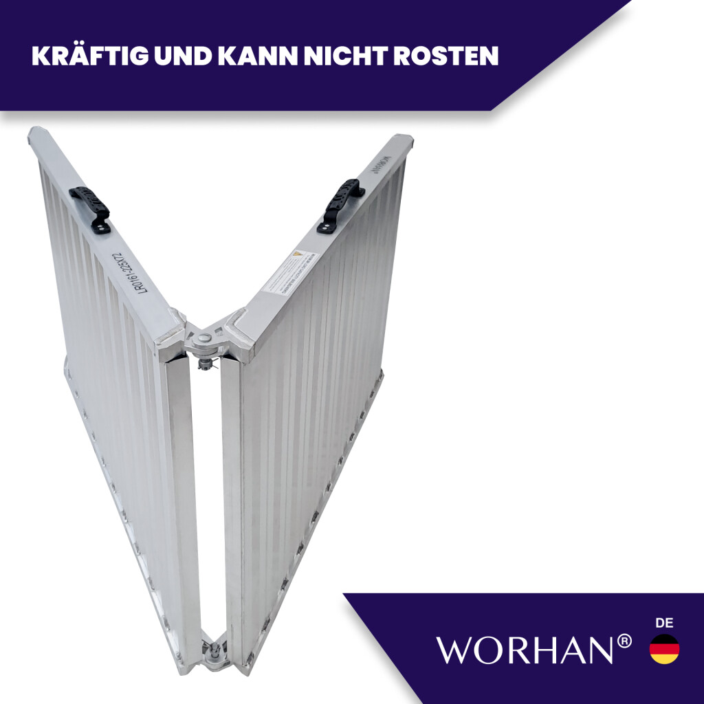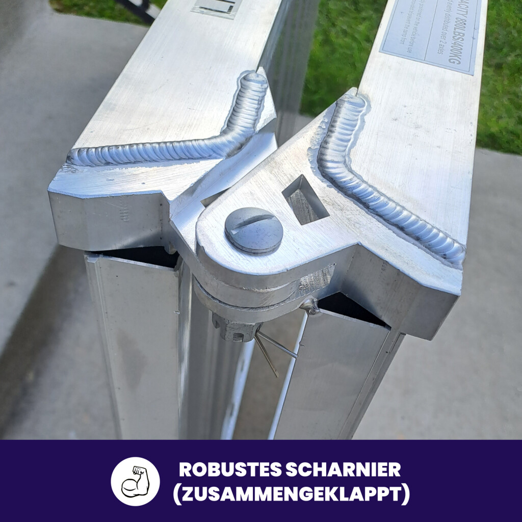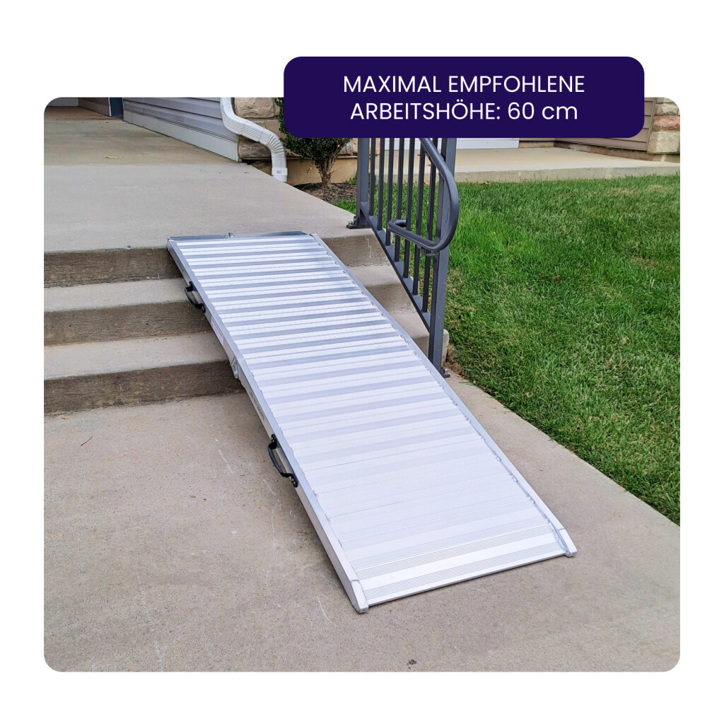 Max. empfohlene Arbeitshöhe - 60cm., Dieses Produkt ist aus hochwertigem Aluminium (EN-131- und CE-Normen) hergestellt., Maximale Belastbarkeit: 400kg., Abmessungen: Länge aufgeklappt: 225cm., Länge zusammengeklappt: 116cm., Breite: 72cm., Gewicht: 26kg., Maße zusammengeklappt: 116cm x 14cm x 72cm., Dies ist ein unverzichtbares Produkt, das Rückenverletzungen vorbeugt und das Be- und Entladen beschleunigt., Hochfestes eloxiertes Aluminium sowie die ultra-rutschfeste Oberfläche. Die Rampe ist mit bequemen und widerstandsfähigen Tragegriffen ausgestattet.