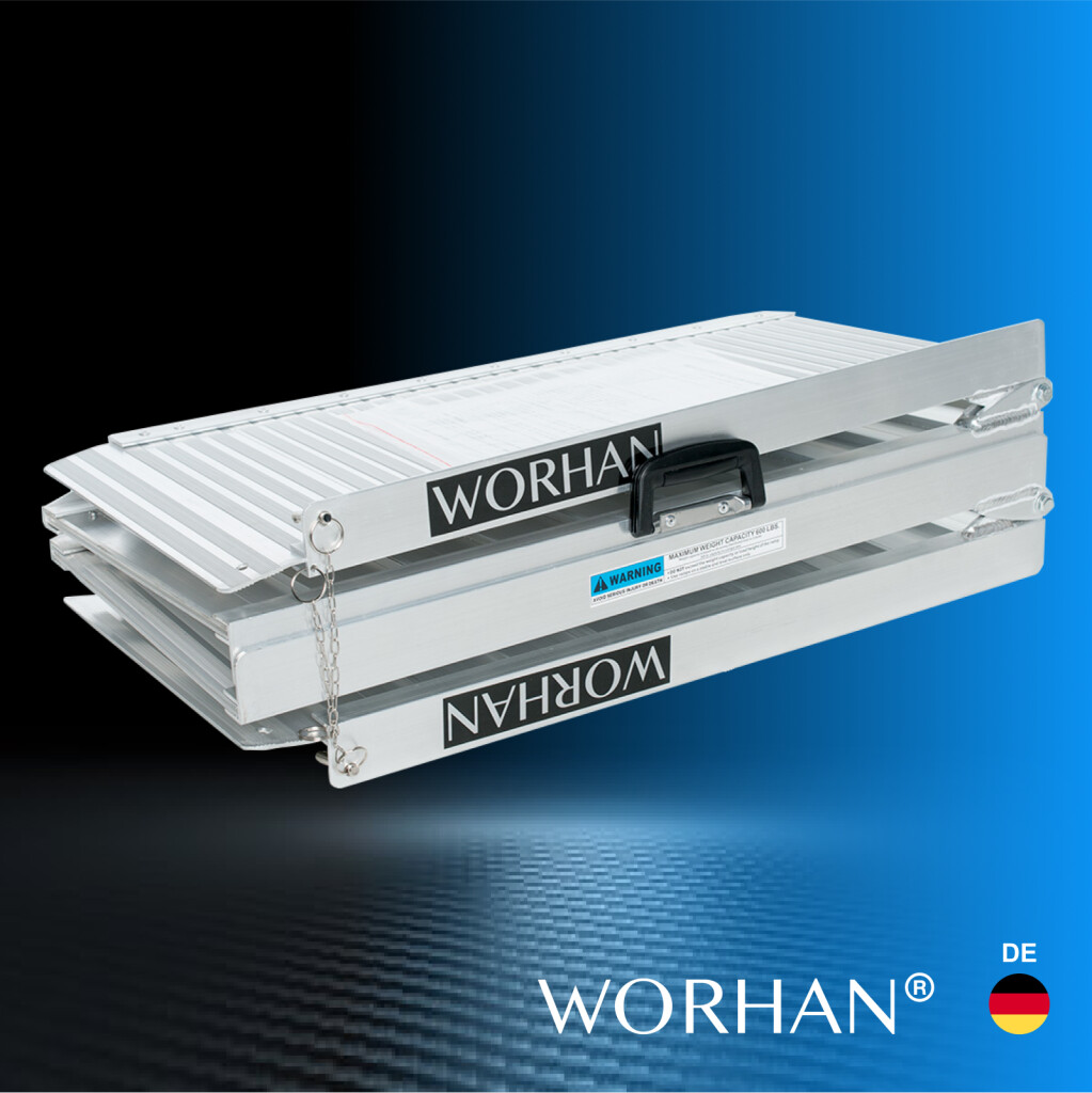 Diese Rampe lässt sich sehr einfach zusammenklappen (zweimal: in Länge und Breite)., Widerstandsfähige und rutschfeste Oberfläche auch bei nassem oder regnerischem Wetter., Langlebiges Produkt im Laufe der Zeit., Material: hochwertiges eloxiertes Aluminium., Optimiertes, solides und einzigartiges Design., Sehr praktisch für die Handhabung oder den Transport und die Lagerung.