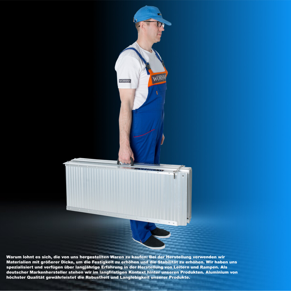 Warum lohnt es sich, die von uns hergestellten Waren zu kaufen: Bei der Herstellung verwenden wir Materialien mit größerer Dicke, um die Festigkeit zu erhöhen und die Stabilität zu erhöhen., Wir haben uns spezialisiert und verfügen über langjährige Erfahrung in der Herstellung von Leitern und Rampen., Als deutscher Markenhersteller stehen wir im langfristigen Kontext hinter unseren Produkten. Aluminium von höchster Qualität gewährleistet die Robustheit und Langlebigkeit unserer Produkte.