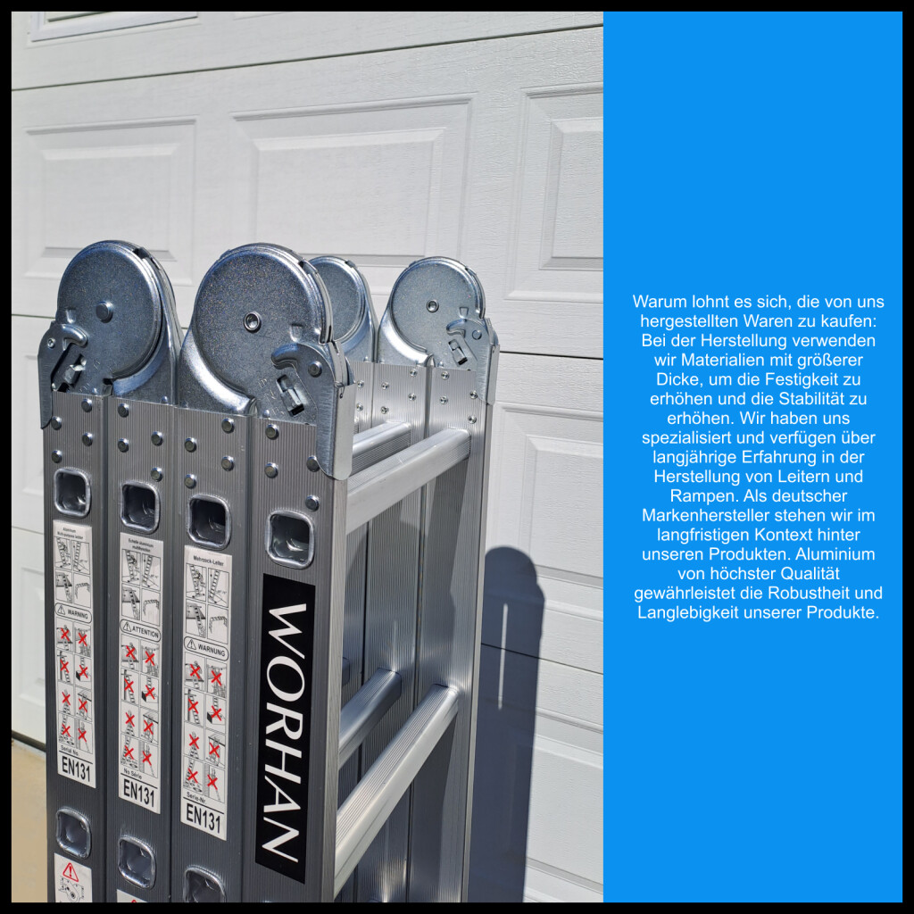 Warum lohnt es sich, die von uns hergestellten Waren zu kaufen: Bei der Herstellung verwenden wir Materialien mit größerer Dicke, um die Festigkeit zu erhöhen und die Stabilität zu erhöhen., Wir haben uns spezialisiert und verfügen über langjährige Erfahrung in der Herstellung von Leitern und Rampen., Als deutscher Markenhersteller stehen wir im langfristigen Kontext hinter unseren Produkten. Aluminium von höchster Qualität gewährleistet die Robustheit und Langlebigkeit unserer Produkte.