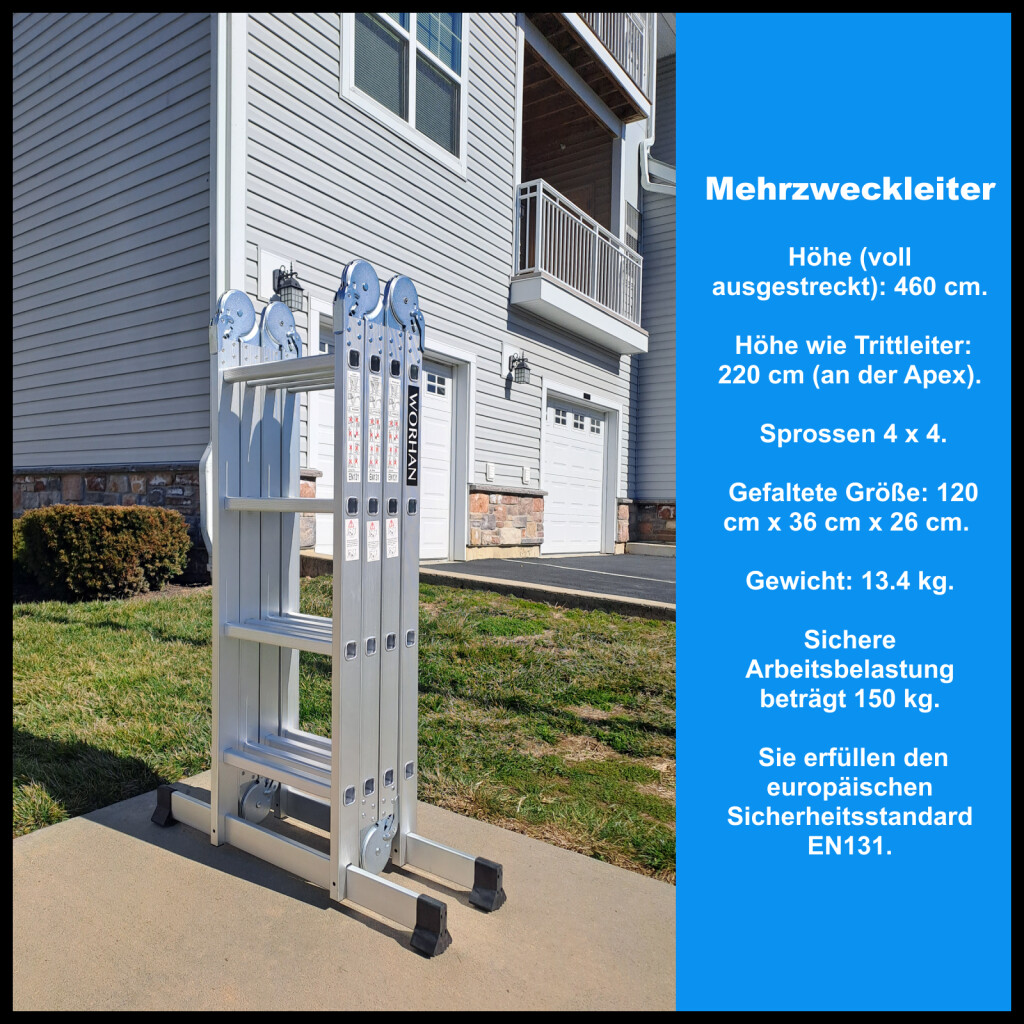 Höhe (voll ausgestreckt): 460cm., Höhe wie Trittleiter: 220cm (an der Apex)., Sprossen 4x4., Gefaltete Größe: 120cm x 36cm x 26cm., Gewicht: 13.4kg