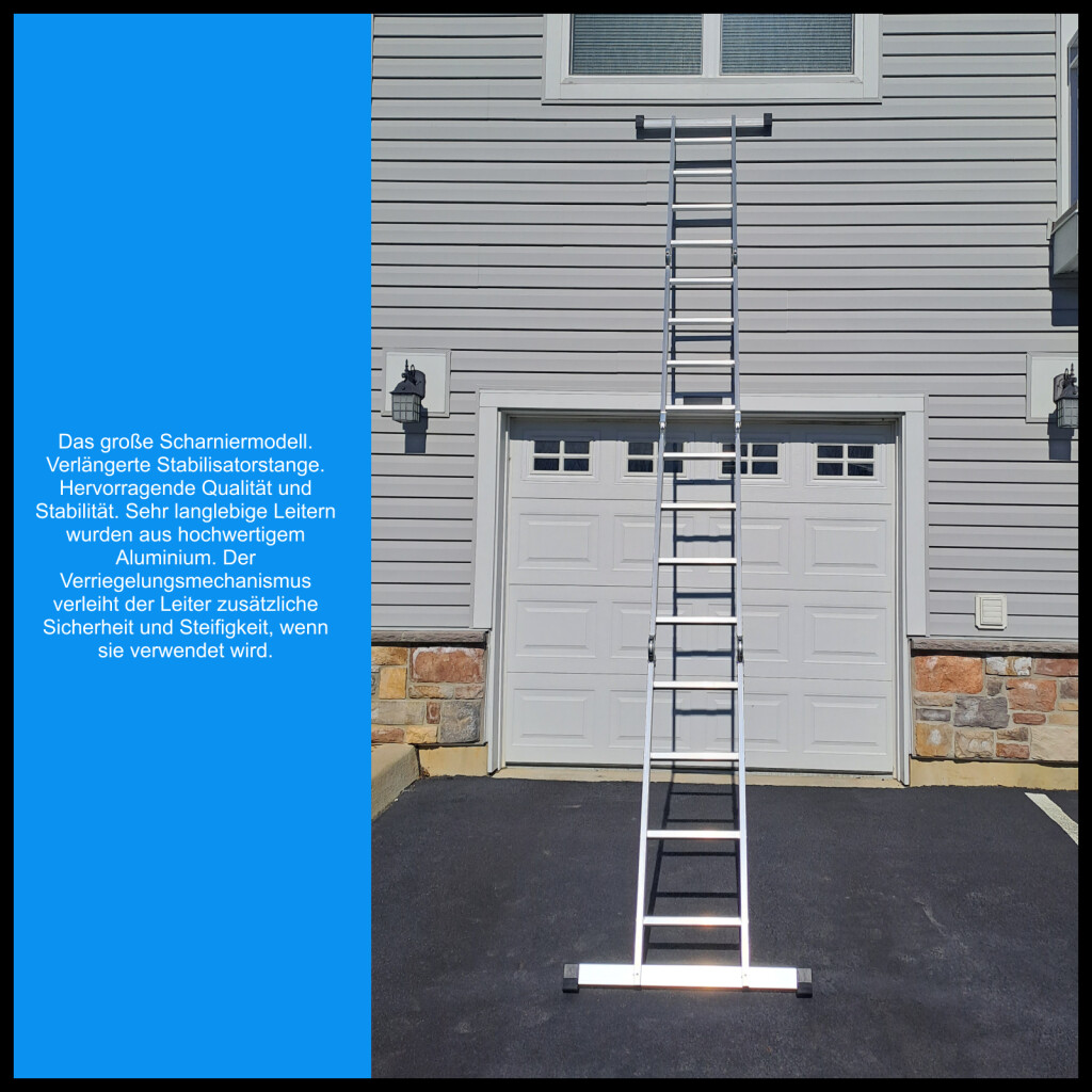 Das große Scharniermodell., Verlängerte Stabilisatorstange., Hervorragende Qualität und Stabilität., Sehr langlebige Leitern wurden aus hochwertigem Aluminium., Der Verriegelungsmechanismus verleiht der Leiter zusätzliche Sicherheit und Steifigkeit, wenn sie verwendet wird.