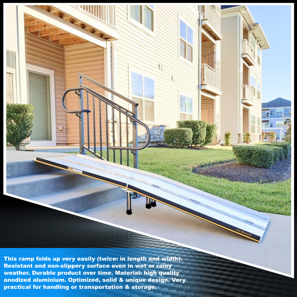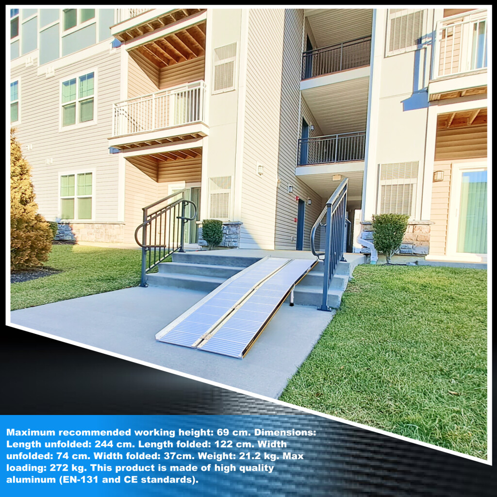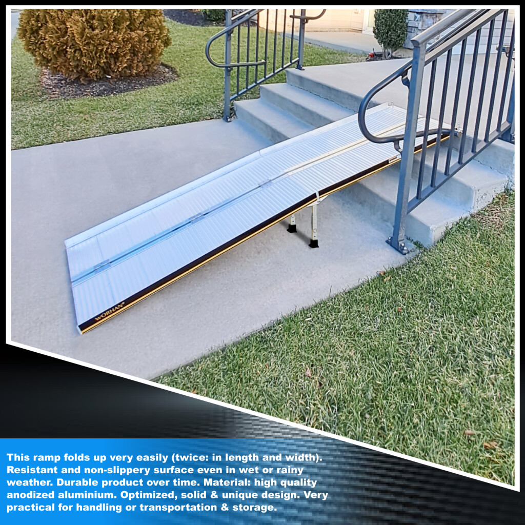 This ramp folds up very easily (twice: in length and width)., Resistant and non-slippery surface even in wet or rainy weather., Durable product over time., Material: high quality anodized aluminium., optimized, solid & unique design., Very practical for handling or transportation & storage.