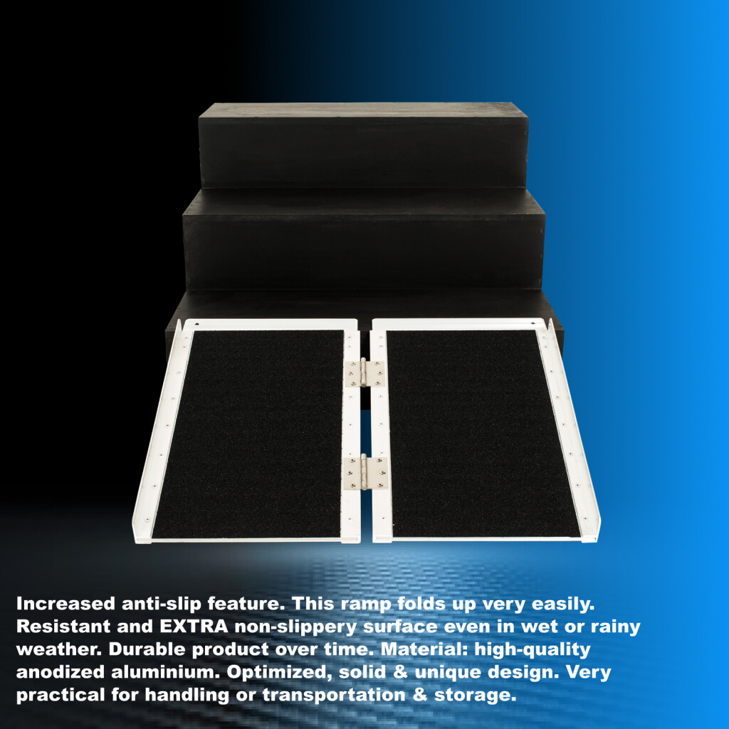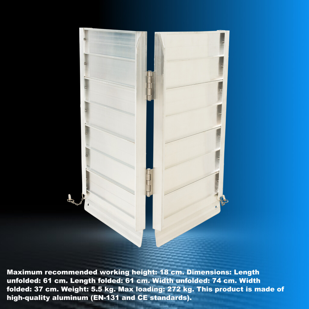 Increased anti-slip feature., This ramp folds up very easily., Resistant and EXTRA non-slippery surface even in wet or rainy weather., Durable product over time., Material: high quality anodized aluminium., optimized, solid & unique design., Very practical for handling or transportation & storage.