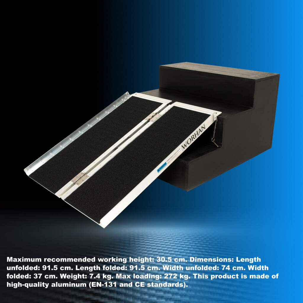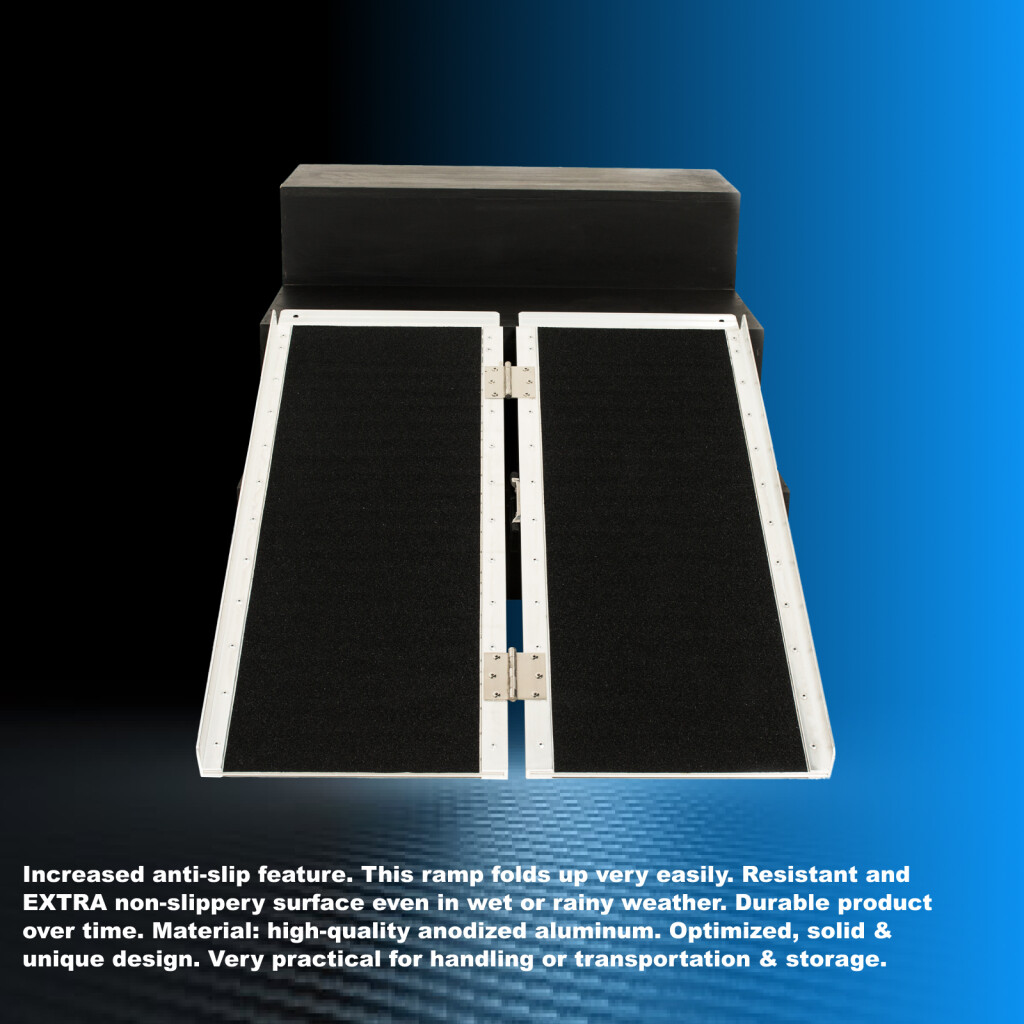 Increased anti-slip feature., This ramp folds up very easily., Resistant and EXTRA non-slippery surface even in wet or rainy weather., Durable product over time., Material: high quality anodized aluminium., optimized, solid & unique design., Very practical for handling or transportation & storage.