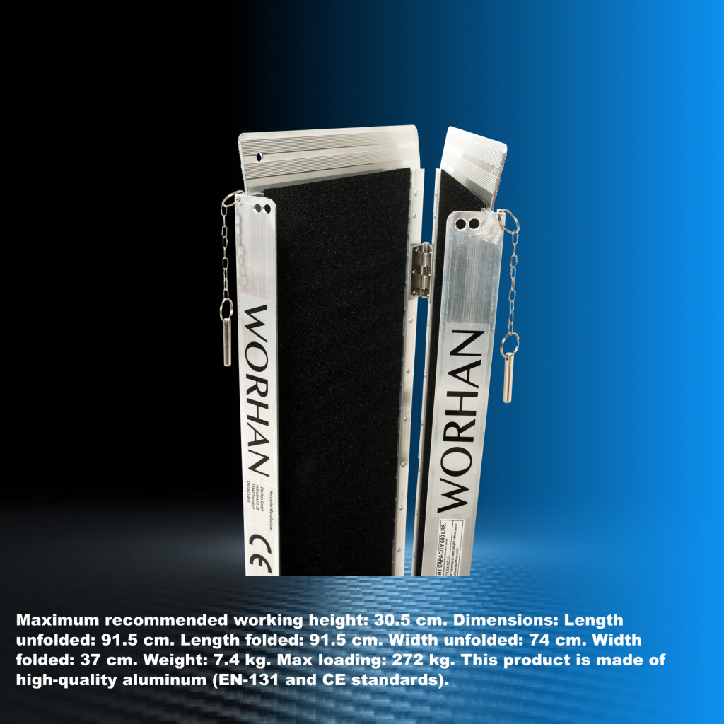 Maximum recommended working height: 30.5cm., Dimensions: Length unfolded: 91.5cm., Length folded: 91.5cm., Width unfolded: 74cm., Width folded: 37cm., Weight: 7.5kg., Max loading: 300kg., This product is made of high quality aluminum (EN-131 and CE standards).