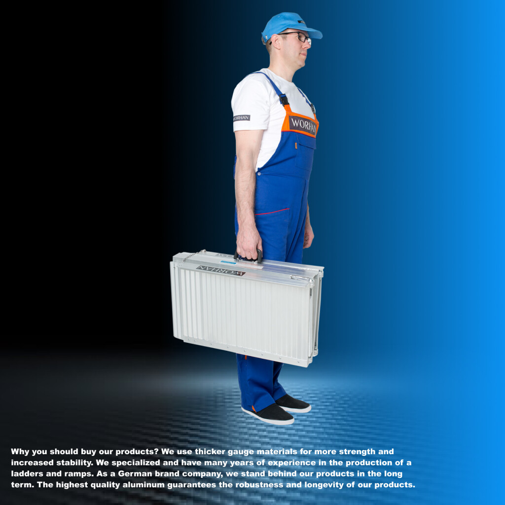 Why you should buy our products? We use thicker gauge materials for more strength and increased stability., We specialized and have many years of experience in the production of a ladders and ramps., As a German brand company, we stand behind our products in the long term., The highest quality aluminum guarantees the robustness and longevity of our products.