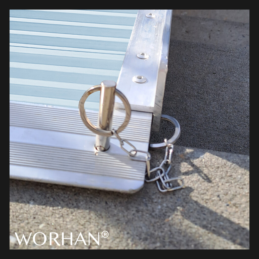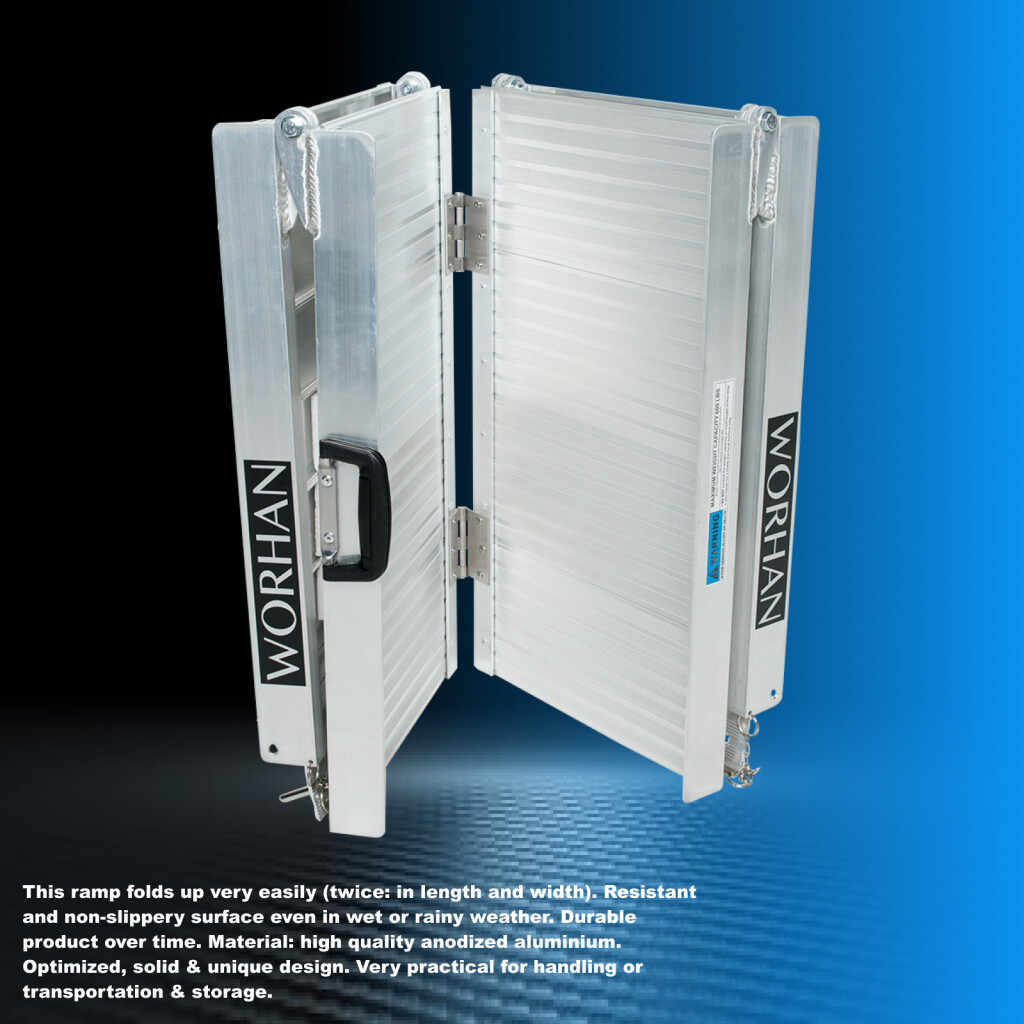 This ramp folds up very easily (twice: in length and width)., Resistant and non-slippery surface even in wet or rainy weather., Durable product over time., Material: high quality anodized aluminium., optimized, solid & unique design., Very practical for handling or transportation & storage.
