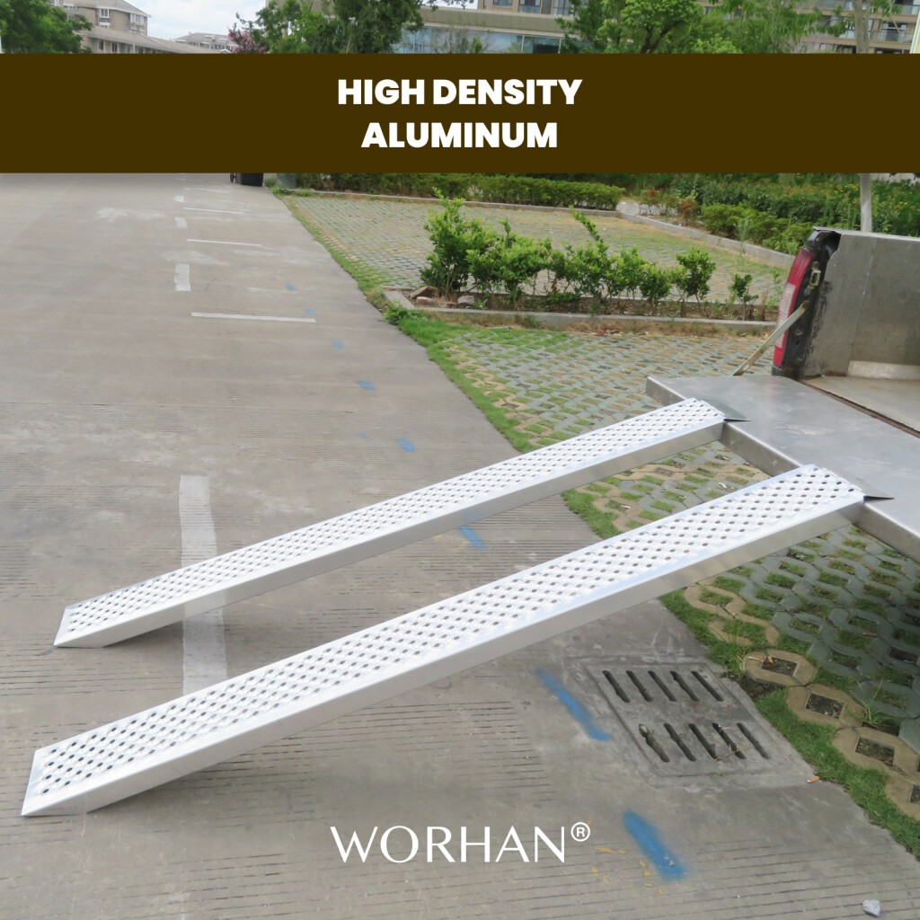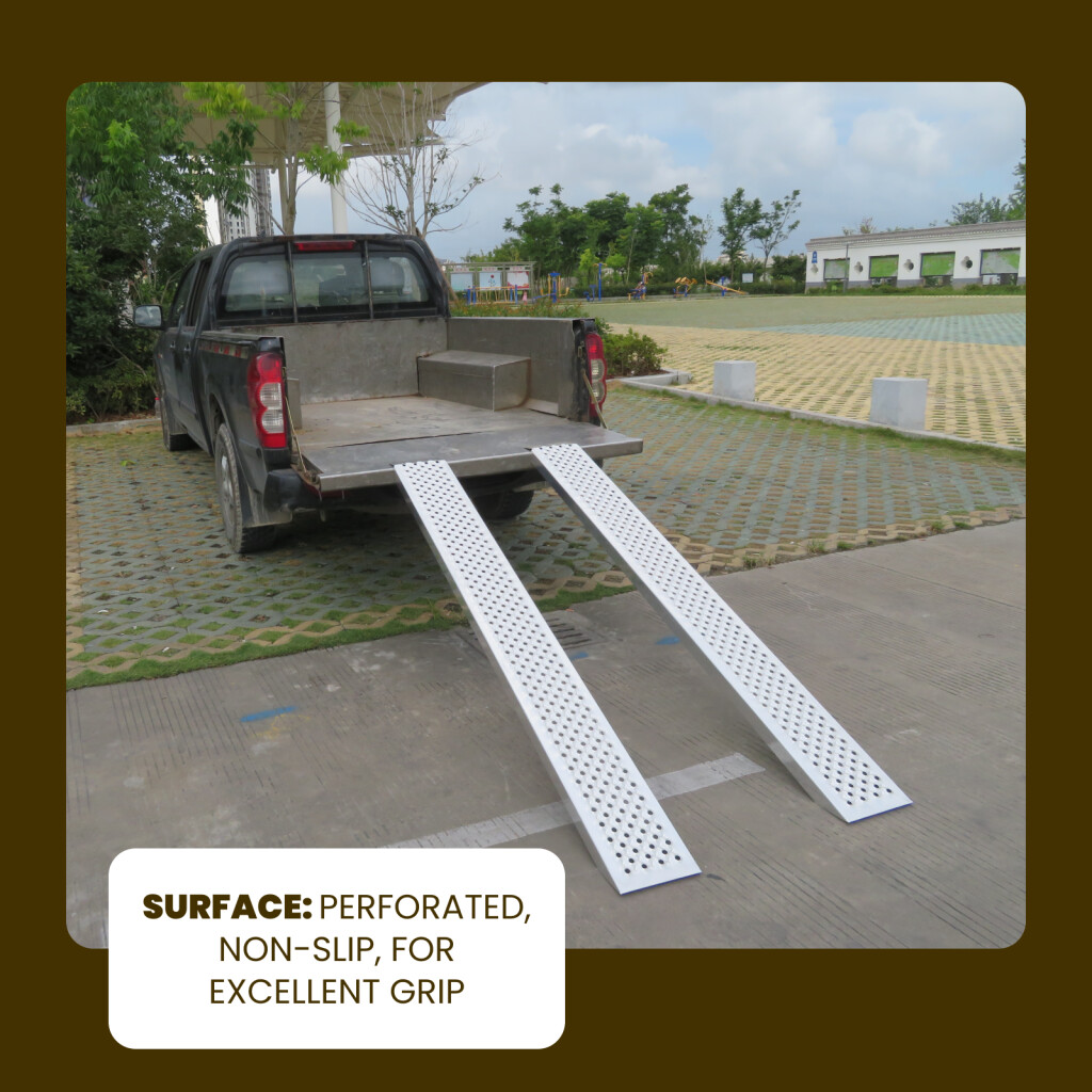 The product is made of high quality aluminum according to EN and CE standards. Being made of aluminium, they are extremely light (5kg each), very robust and cannot rust. Surface: perforated - non-slip, for excellent grip. Product details and dimensions: Weight - 5kg (10kg per pair).,Length - 200cm., Width - 214mm., Depth - 55mm., Maximum load weight - 400kg (per pair). GERMAN BRAND. EXCEPTIONAL CUSTOMER SERVICE. The ramps could be used to load tractors or lawnmowers, Quad ATVs, trailers, electric bikes, motorcycles etc etc. Chamfered side edges to ensure increased contact at the upper bearing point. Why you should buy the products we manufacture: During manufacture, we use thicker gauge materials for greater strength and increased stability. We are specialized and have many years of experience in the production of ladders and ramps. As a German brand company, we stand behind our products in the long term. The highest quality aluminum guarantees the robustness and longevity of our products.