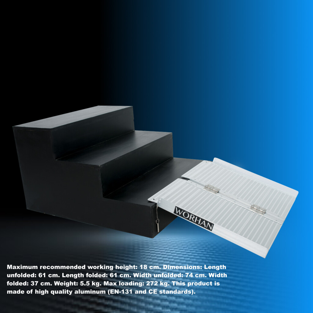 This ramp folds up very easily., Resistant and non-slippery surface even in wet or rainy weather., Durable product over time., Material: high quality anodized aluminium., optimized, solid & unique design., Very practical for handling or transportation & storage.