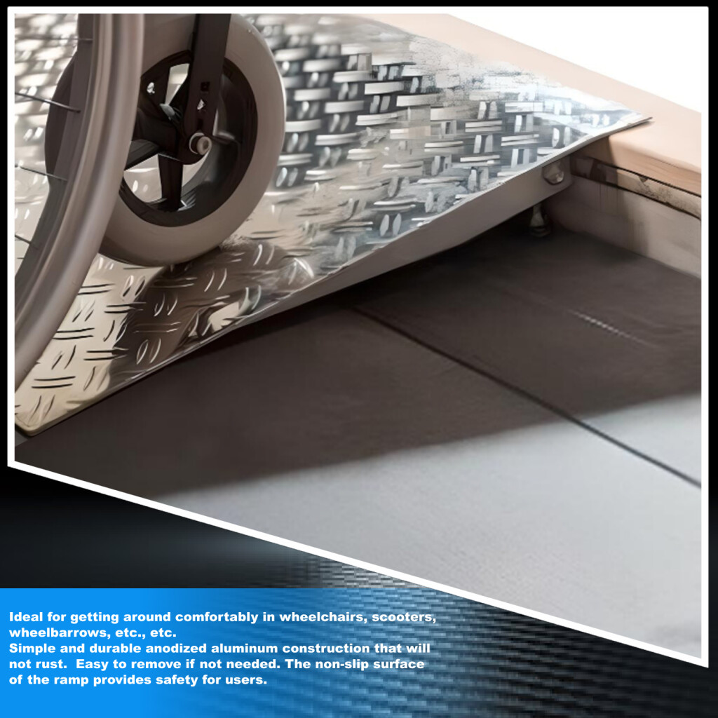 This ramp will simplify the crossing of obstacles such as: high thresholds, wires, pipes, and other places which prevent the practical movement of people or cargo. The variable height function (from 5 cm to 10 cm) makes any task easier. Manufactured according to EN-131 and CE standards Technical characteristics: Size: 72cm (width) x 41cm (length), Weight 3.8kg, Maximum load capacity: 300kg, designed to overcome height obstacles (from 5cm to 10cm) . Variable height function. The height is adjustable in increments of 1mm No assembly is required. Ideal for getting around comfortably in wheelchairs, scooters, wheelbarrows, etc., etc. Simple and durable anodized aluminum construction that will not rust. Easy to remove if needed. The non-slip surface of the ramp provides safety for the users.