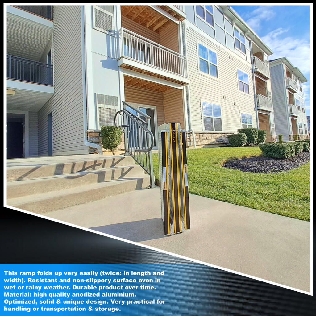 This ramp folds up very easily (twice: in length and width)., Resistant and non-slippery surface even in wet or rainy weather., Durable product over time., Material: high quality anodized aluminium., optimized, solid & unique design., Very practical for handling or transportation & storage.