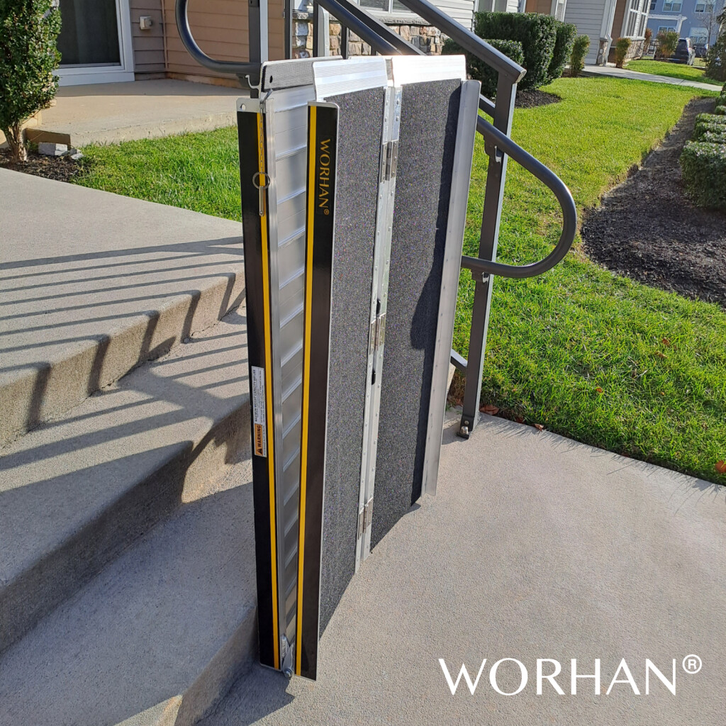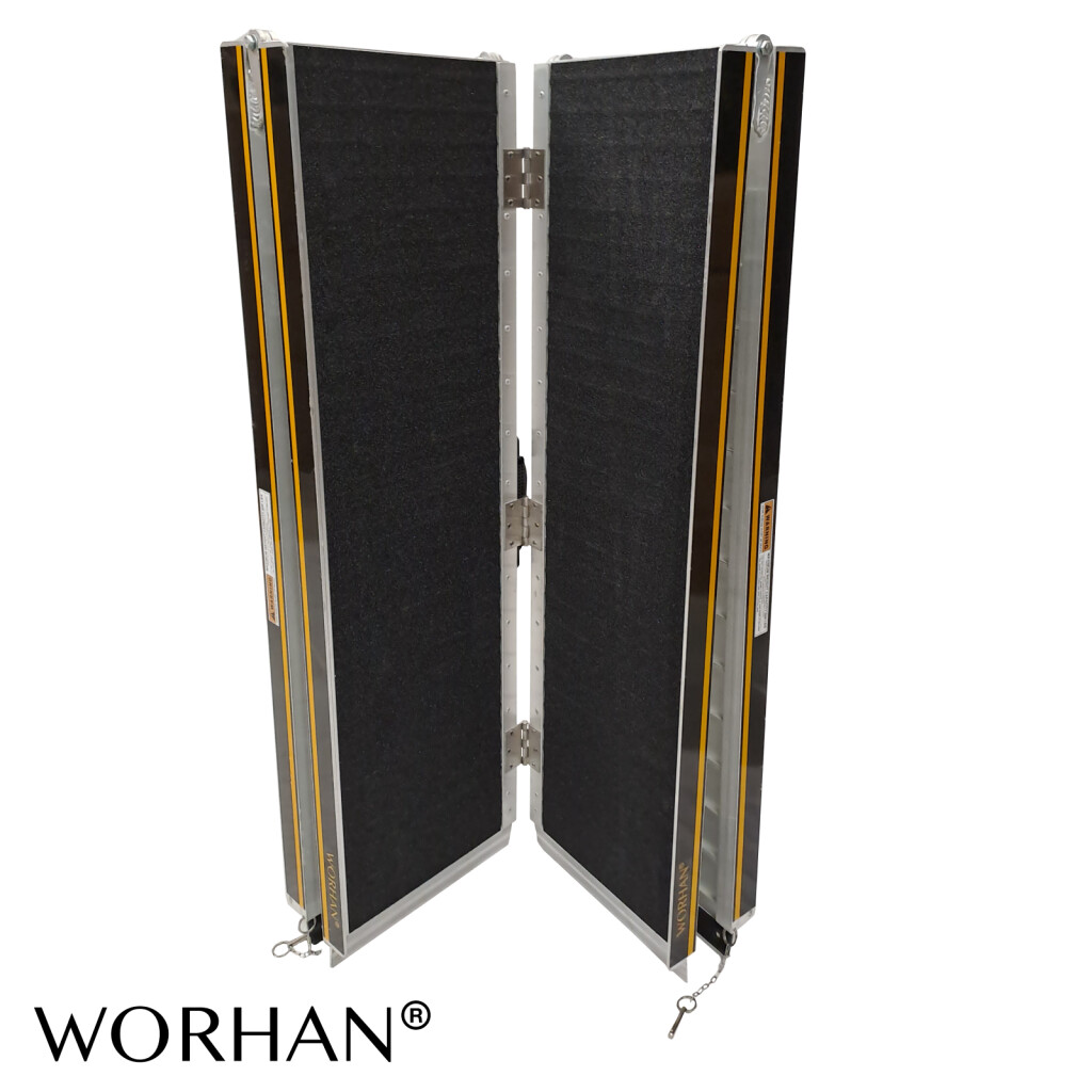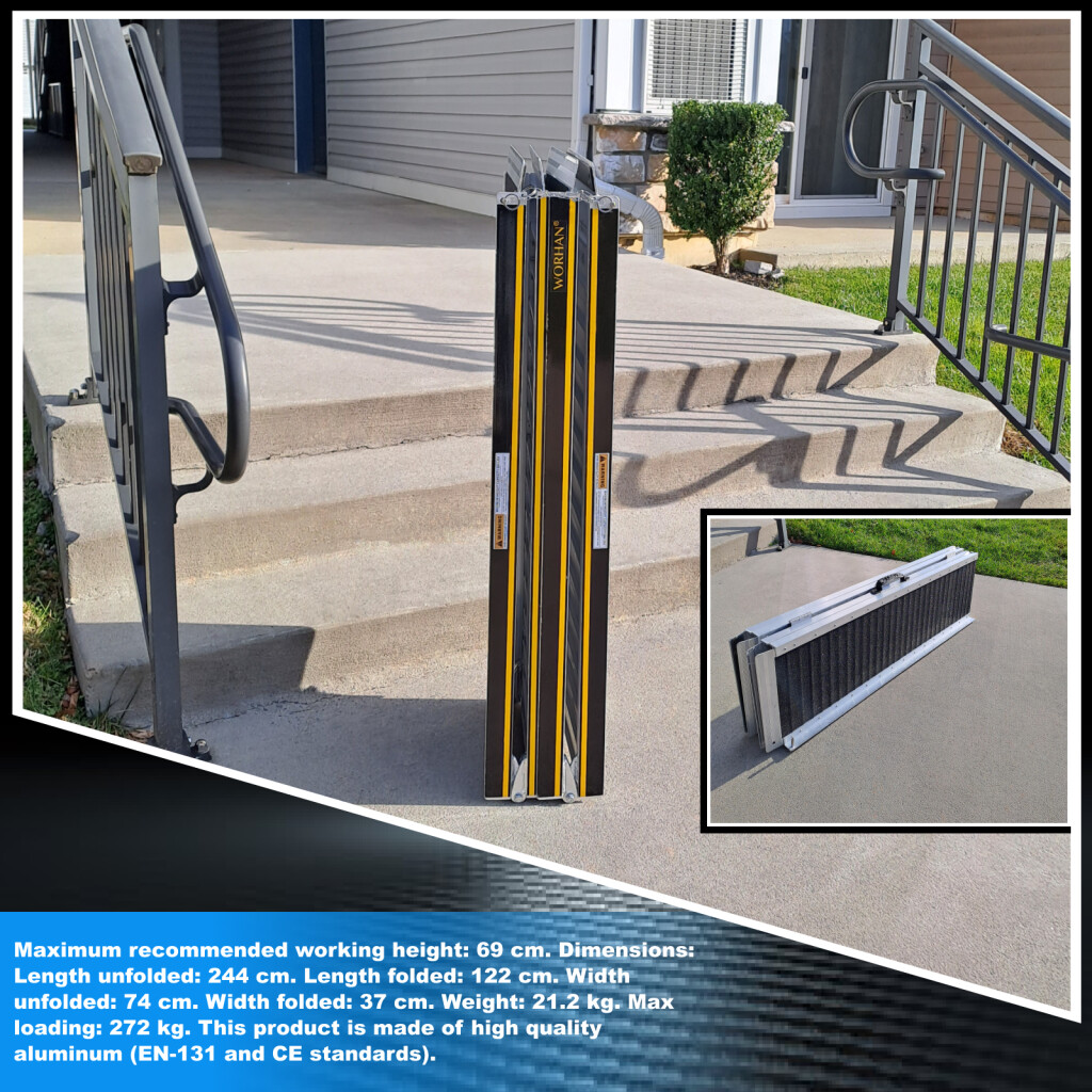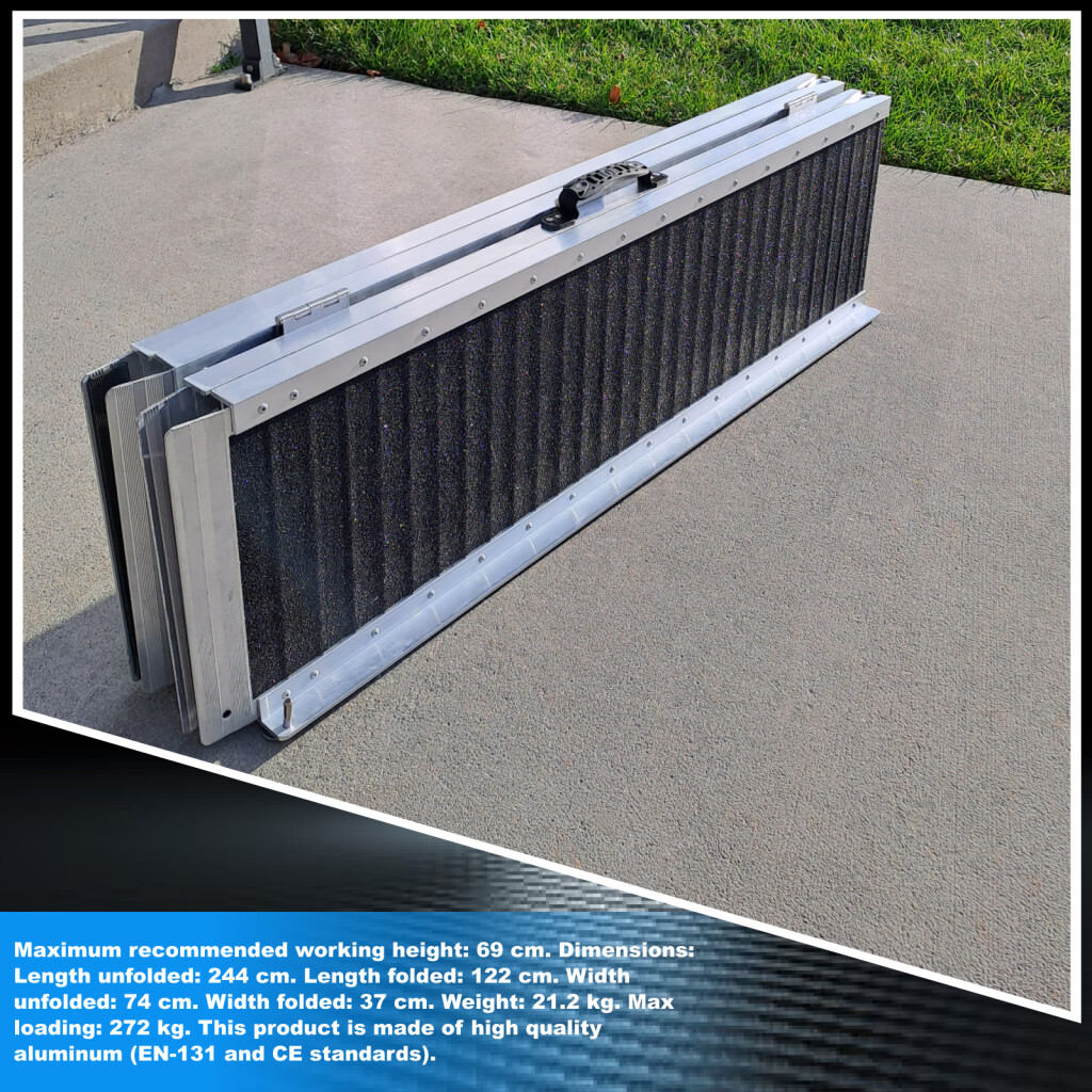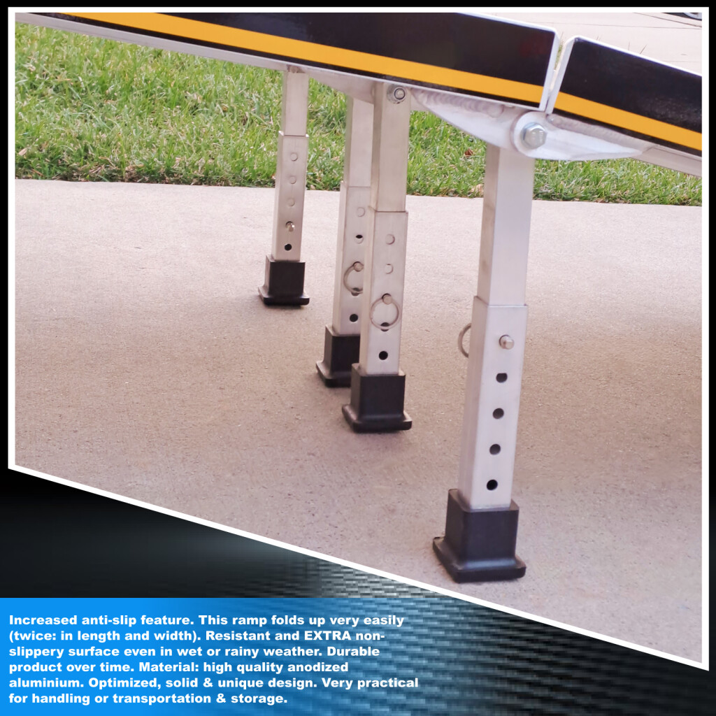 Increased anti-slip feature., This ramp folds up very easily (twice: in length and width)., Resistant and EXTRA non-slippery surface even in wet or rainy weather., Durable product over time., Material: high quality anodized aluminium., optimized, solid & unique design., Very practical for handling or transportation & storage.