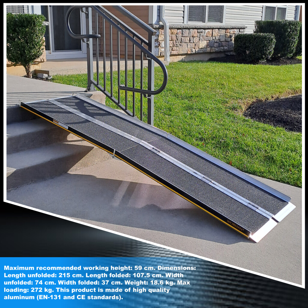 Increased anti-slip feature., This ramp folds up very easily (twice: in length and width)., Resistant and EXTRA non-slippery surface even in wet or rainy weather., Durable product over time., Material: high quality anodized aluminium., optimized, solid & unique design., Very practical for handling or transportation & storage.