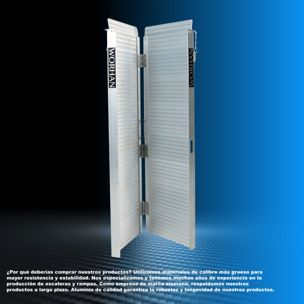 Esta rampa se pliega muy fácilmente., Superficie resistente y antideslizante incluso con tiempo húmedo o lluvioso., Producto duradero en el tiempo., Material: aluminio anodizado de alta calidad., Diseño optimizado, sólido y único., Muy práctico para manipulación o transporte y almacenamiento.