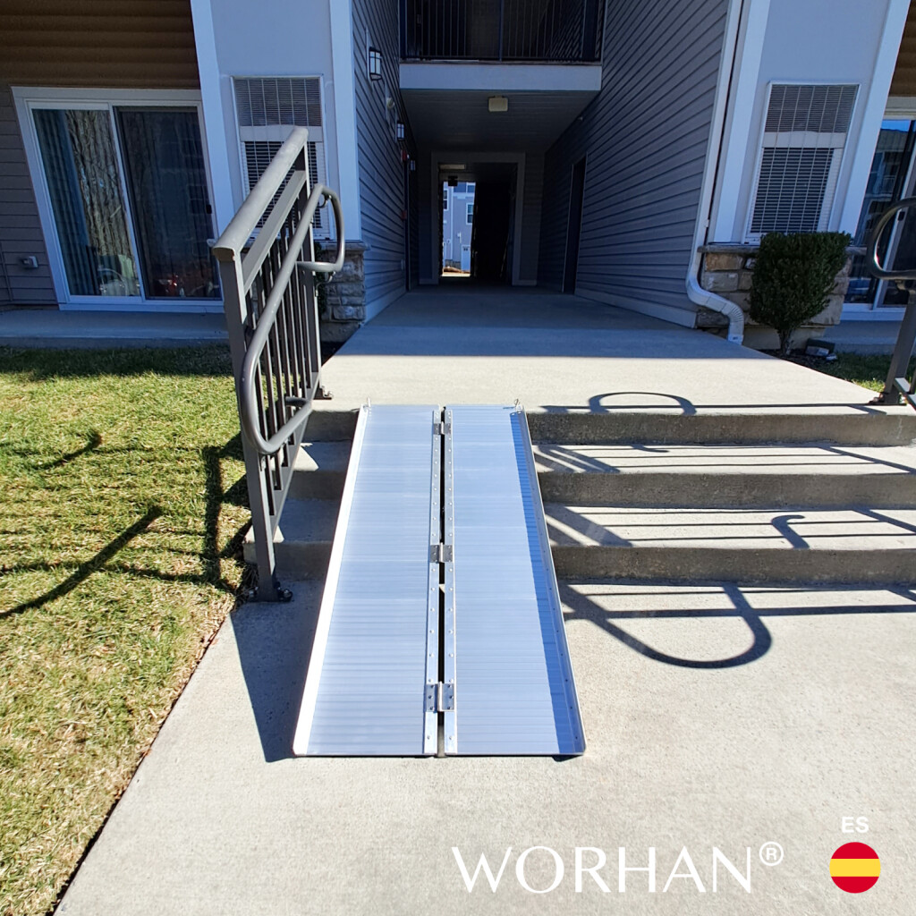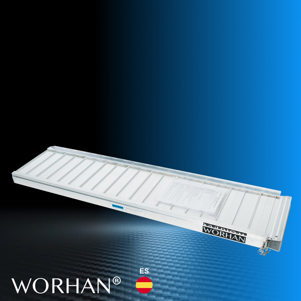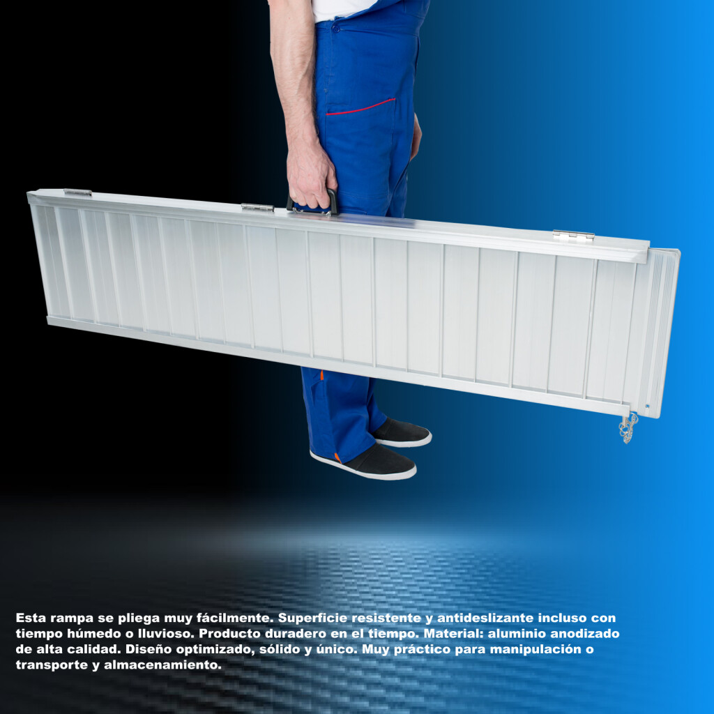 Esta rampa se pliega muy fácilmente., Superficie resistente y antideslizante incluso con tiempo húmedo o lluvioso., Producto duradero en el tiempo., Material: aluminio anodizado de alta calidad., Diseño optimizado, sólido y único., Muy práctico para manipulación o transporte y almacenamiento.