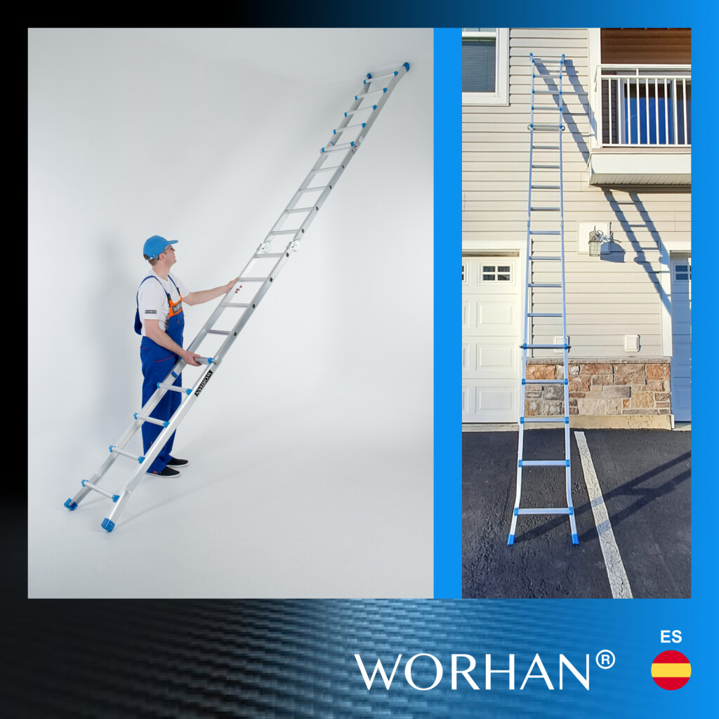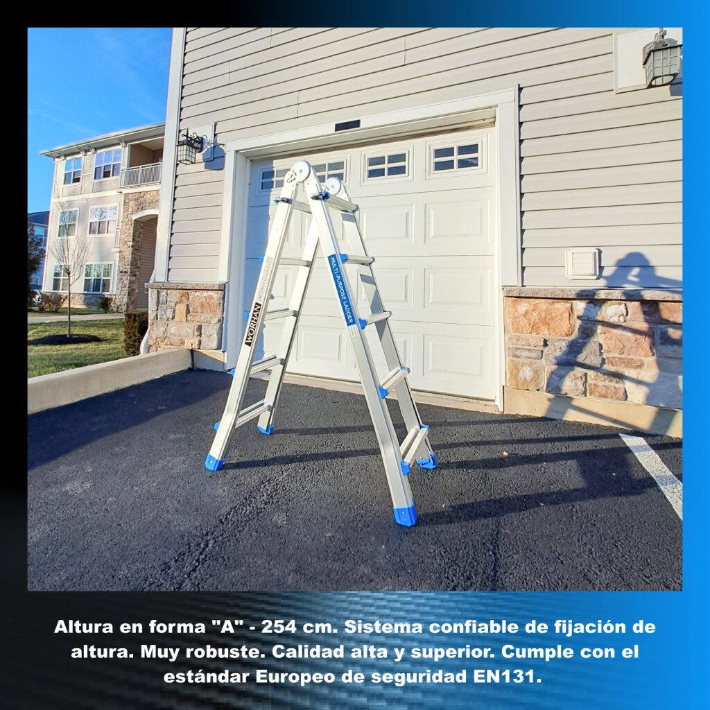Altura: 530cm., Altura tijera: 254cm., Distancia entre peldaños: 28cm., Peldaños: 2x8., Dimensiones (plegada): 156cm x 48cm x 21cm., Peso: 13.2kg. MARCA ALEMANA., SERVICIO AL CLIENTE EXCEPCIONAL. Fabricado estrictamente a las normas de seguridad Europeo EN131., Carga de trabajo segura - 150 kg., Diseño extensible y plegable para un uso versátil., El mecanismo de bloqueo seguro, simple y conveniente garantiza la facilidad de ajuste de la altura de trabajo. Calidad y estabilidad superiores., Las escaleras muy duraderas se han fabricado con aluminio de alta calidad. El mecanismo de bloqueo agrega seguridad y rigidez adicionales a la escalera cuando está en uso. ¿Por qué deberías comprar nuestros productos? Utilizamos materiales de calibre más grueso para mayor resistencia y estabilidad. Nos especializamos y tenemos muchos años de experiencia en la producción de escaleras y rampas. Como empresa de marca alemana, respaldamos nuestros productos a largo plazo. aluminio de calidad garantiza la robustez y longevidad de nuestros productos.
