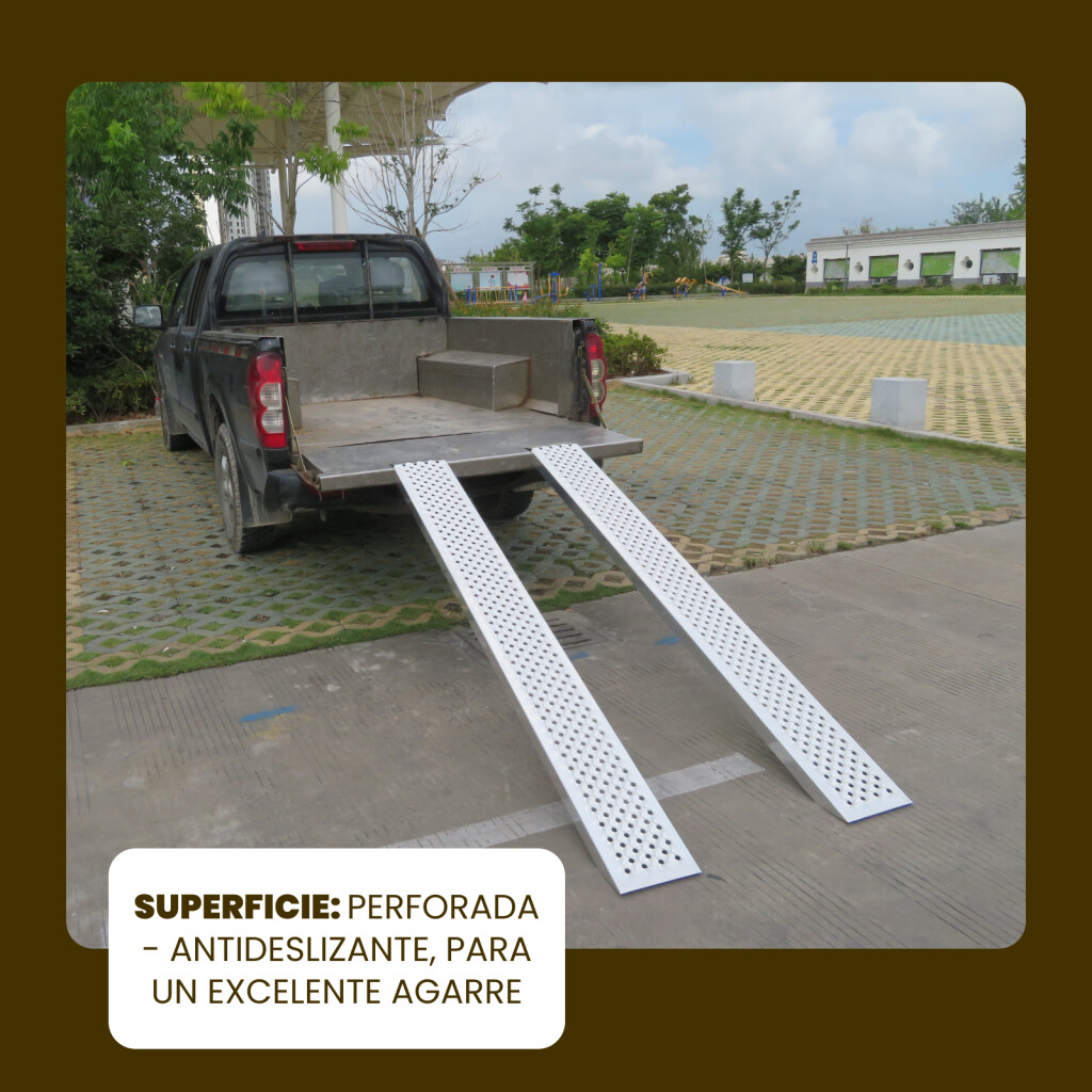 El producto está fabricado en aluminio de alta calidad según las normas EN y CE. Al estar fabricados en aluminio, son extremadamente ligeros (5 kg cada uno), muy robustos y no se oxidan. Superficie: perforada - antideslizante, para un excelente agarre. Detalles y dimensiones del producto: Peso - 5 kg (10 kg por par), Largo - 200 cm, Ancho - 214 mm, Fondo - 55 mm, Peso máximo de carga - 400 kg (por par). MARCA ALEMANA SERVICIO AL CLIENTE EXCEPCIONAL. Las rampas se pueden utilizar para cargar tractores o cortadoras de césped, quads, remolques, bicicletas eléctricas, motocicletas, etc. Bordes laterales biselados para garantizar un mayor contacto en el punto de apoyo superior. Por qué debería comprar los productos que fabricamos: durante la fabricación, utilizamos materiales de calibre más grueso para una mayor resistencia y una mayor estabilidad. Estamos especializados y tenemos muchos años de experiencia en la producción de escaleras y rampas. Como empresa de marca alemana, respaldamos nuestros productos a largo plazo El aluminio de la más alta calidad garantiza la robustez y longevidad de nuestros productos.