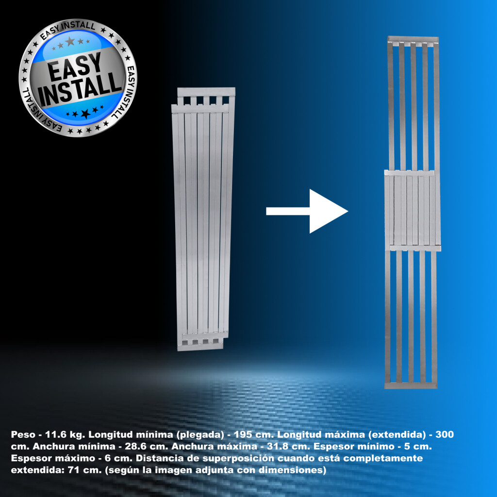El producto está fabricado en aluminio de alta calidad según las normas EN y CE. ¡Diseño de perfil de aluminio entrelazado para soportar un peso de hasta 300 kg! Cuenta con 3 asas resistentes y una superficie grabada antideslizante para un mejor agarre. Peso: 11,6 kg., Longitud mínima (plegada): 195 cm, Longitud máxima (extendida): 300 cm, Ancho mínimo: 28,6 cm, Ancho máximo: 31,8 cm, Grosor mínimo: 5 cm, Grosor máximo: 6 cm. Distancia de superposición cuando está completamente extendida: 71 cm. (según imagen adjunta con dimensiones) MARCA ALEMANA. SERVICIO AL CLIENTE EXCEPCIONAL. Instalación súper rápida. Capacidad para desplegar y usar la rampa en cualquier longitud entre los valores de longitud mínima y máxima. Topes de longitud máxima de aluminio integrados. Por qué debería comprar los productos que fabricamos: durante la fabricación, utilizamos materiales de calibre más grueso para una mayor resistencia y una mayor estabilidad. Estamos especializados y tenemos muchos años de experiencia en la producción de escaleras y rampas. Como empresa de marca alemana, respaldamos nuestros productos a largo plazo El aluminio de la más alta calidad garantiza la robustez y longevidad de nuestros productos.