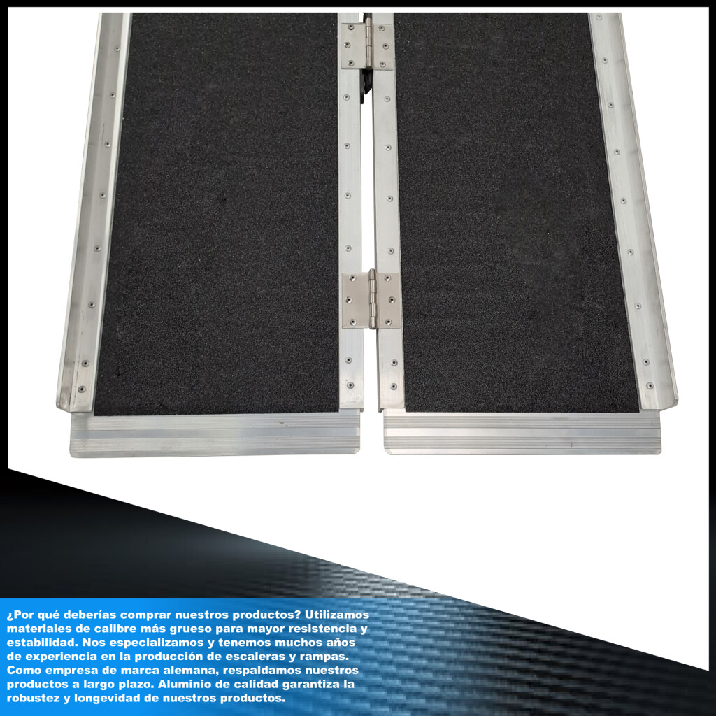 Función antideslizante aumentada., Esta rampa se pliega muy fácilmente (dos veces: en largo y ancho)., Superficie resistente y EXTRA antideslizante incluso con tiempo húmedo o lluvioso., Producto duradero en el tiempo., Material: aluminio anodizado de alta calidad., Diseño optimizado, sólido y único., Muy práctico para manipulación o transporte y almacenamiento.