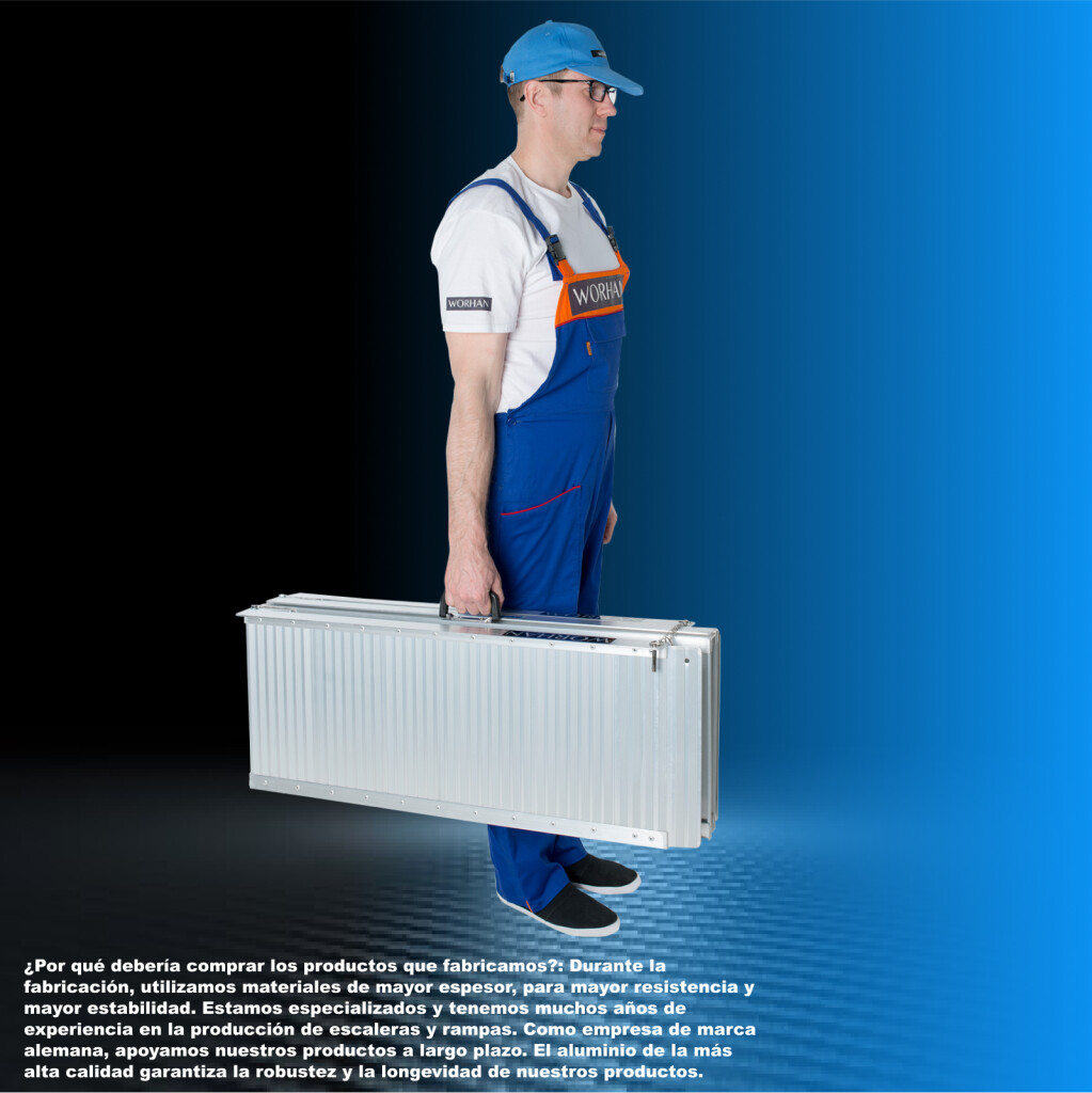 ¿Por qué deberías comprar nuestros productos? Utilizamos materiales de calibre más grueso para mayor resistencia y estabilidad. Nos especializamos y tenemos muchos años de experiencia en la producción de escaleras y rampas. Como empresa de marca alemana, respaldamos nuestros productos a largo plazo. aluminio de calidad garantiza la robustez y longevidad de nuestros productos.