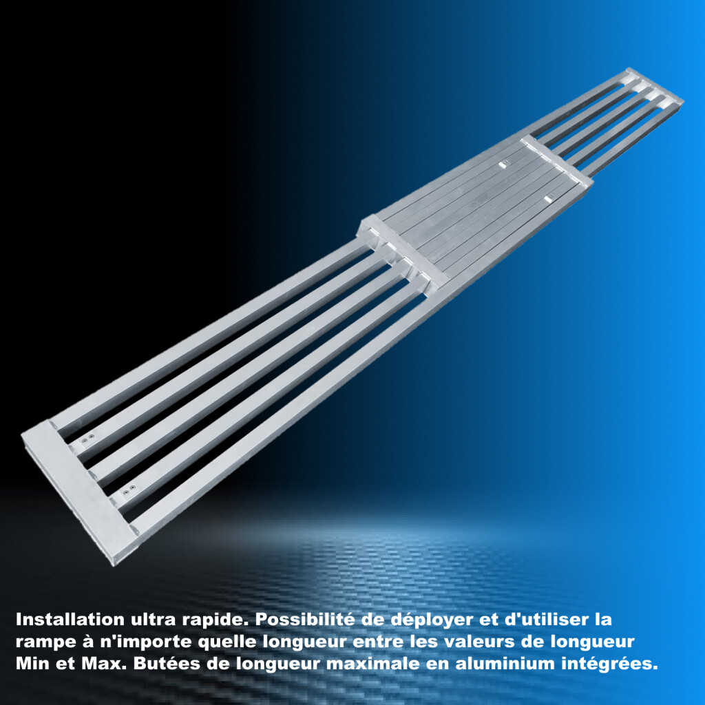 Le produit est fabriqué en aluminium de haute qualité conformément aux normes EN et CE. Conception de profil en aluminium emboîtable pour supporter un poids allant jusqu'à 300 kg!!! Doté de 3 poignées robustes et d'une surface gravée antidérapante pour une prise améliorée. Poids - 11.6kg., Longueur Min (plié) - 195cm., Longueur Max (déployé) - 300cm., Largeur Min - 28.6cm., Largeur Max - 31.8cm., Épaisseur Min - 5cm., Épaisseur Max - 6cm., Distance de chevauchement une fois complètement déployé - 71cm. (selon l'image ci-jointe avec dimensions) MARQUE ALLEMANDE. SERVICE CLIENTELE EXEPTIONNEL. Installation ultra rapide. Possibilité de déployer et d'utiliser la rampe à n'importe quelle longueur entre les valeurs de longueur Min et Max. Butées de longueur maximale en aluminium intégrées. Pourquoi devriez-vous d'acheter les produits que nous fabriquons: lors de la fabrication, nous utilisons des matériaux de calibre plus épais,pour une plus grande résistance et une stabilité accrue.Nous sommes spécialisés et avons de nombreuses années d'expérience dans la production d'échelles et de rampes.En tant qu'entreprise de de la marque allemande,nous soutenons nos produits dans le long terme.L'aluminium de la plus haute qualité garantit la robustesse et la longévité de nos produits.