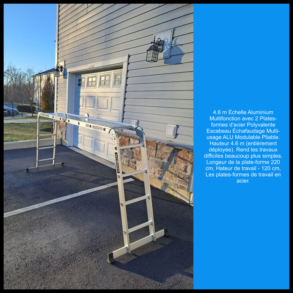 Hauteur: 460cm., Hauteur Escabeau: 220cm., Échelons: 4x4., Taille pliée: 120cm x 36cm x 26cm., Poids: 18kg. L'échelle est livrée avec 2 plates-formes en aluminium. MARQUE ALLEMANDE., SERVICE CLIENTELE EXEPTIONNEL. Fabriqué strictement aux normes de sécurité EN131., Matériaux: Aluminium anodisé., Poids maximal: 150kg., Echelons spéciaux antidérapants striés., Mécanisme de verrouillage facile à utiliser. Le grand modèle de charnière., barre stabilisatrice étendue., Qualité et Stabilité Supérieure., Échelles très durables ont été fabriquées à partir d'aluminium de haute qualité., Mécanisme de blocage ajoutant une sécurité supplémentaire et de la rigidité à l'échelle lors de son utilization. Pourquoi devriez-vous d'acheter les produits que nous fabriquons:Lors de la fabrication, nous utilisons des matériaux de calibre plus épais,pour une plus grande résistance et une stabilité accrue.Nous sommes spécialisés et avons de nombreuses années d'expérience dans la production d'échelles et de rampes.En tant qu'entreprise de de la marque allemande,nous soutenons nos produits dans le long terme.L'aluminium de la plus haute qualité garantit la robustesse et la longévité de nos produits.