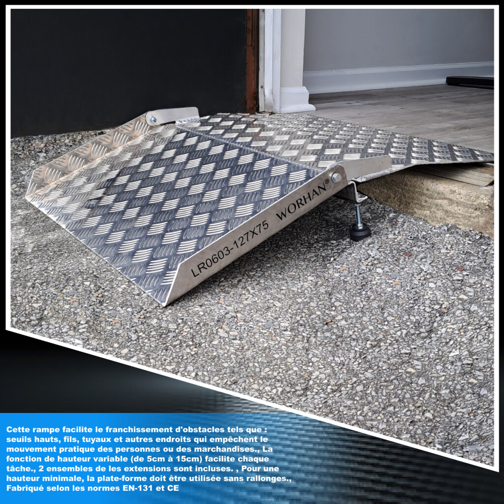 Cette rampe facilite le franchissement d'obstacles tels que : seuils hauts, fils, tuyaux et autres endroits qui empêchent le mouvement pratique des personnes ou des marchandises., La fonction de hauteur variable (de 5cm à 15cm) facilite chaque tâche., 2 ensembles de les extensions sont incluses. , Pour une hauteur minimale, la plate-forme doit être utilisée sans rallonges., Fabriqué selon les normes EN-131 et CE Spécifications : 75cm (largeur) x 87cm (longueur), poids 9.2kg, capacité de charge maximale : 300kg, conçu pour franchir les obstacles en hauteur (de 5cm à 15cm). Fonction de hauteur variable., La hauteur est réglable par incréments de 1mm Aucun assemblage n'est requis. Idéal pour se déplacer confortablement en fauteuil roulant, scooter, brouette, etc. Construction en aluminium anodisé simple et durable qui ne rouille pas. Facile à enlever si nécessaire. La surface antidérapante de la rampe assure la sécurité des utilisateurs.