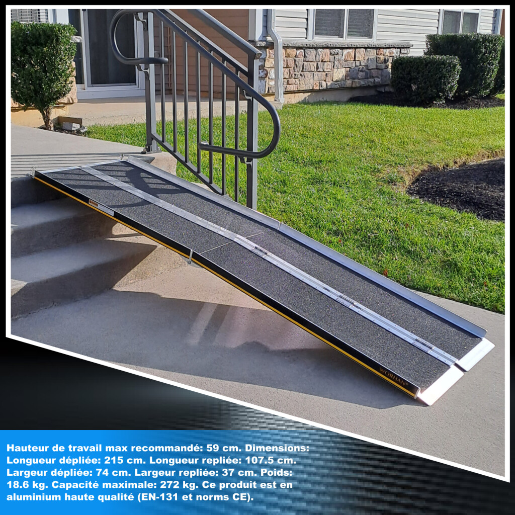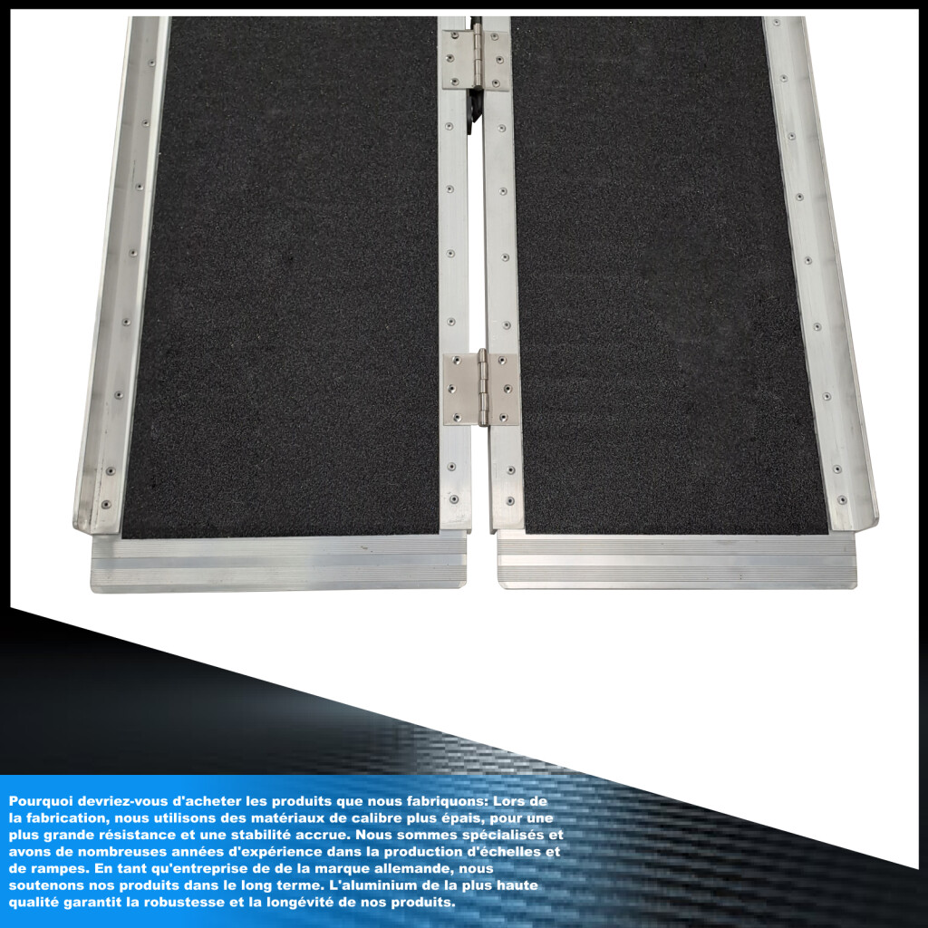 Fonction Antidérapante Elevée., Cette rampe d'accès se replie très facilement (2 fois: en longueur et largeur)., Surfaces résistantes et EXTRA anti-glissantes même par temps humide ou pluie., Produit durable dans le temps. Matériel: aluminium anodisé de haute qualité., Conception optimisée, unique et solide., Très pratique pour la manutention ou le transport en voiture ainsi que pour le stockage.