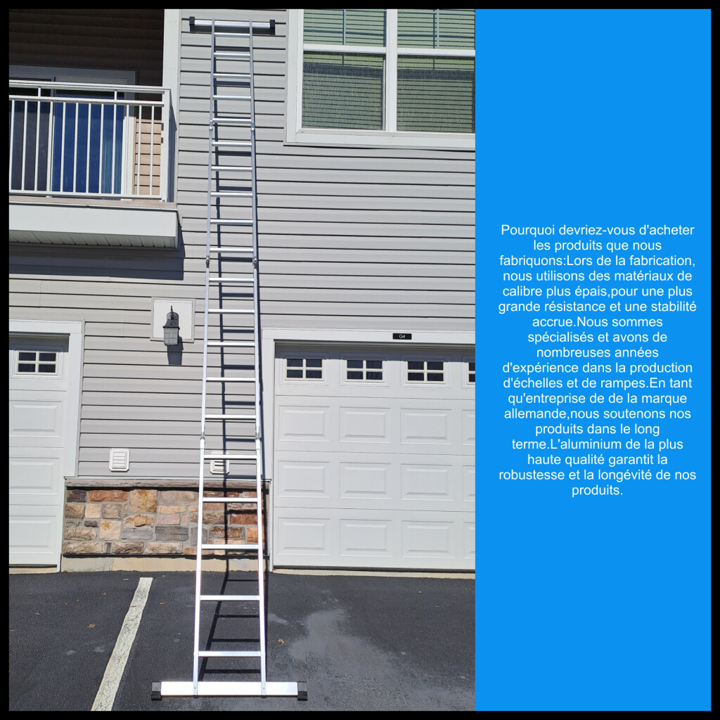 Pourquoi devriez-vous d'acheter les produits que nous fabriquons:Lors de la fabrication, nous utilisons des matériaux de calibre plus épais,pour une plus grande résistance et une stabilité accrue.Nous sommes spécialisés et avons de nombreuses années d'expérience dans la production d'échelles et de rampes.En tant qu'entreprise de de la marque allemande,nous soutenons nos produits dans le long terme.L'aluminium de la plus haute qualité garantit la robustesse et la longévité de nos produits.