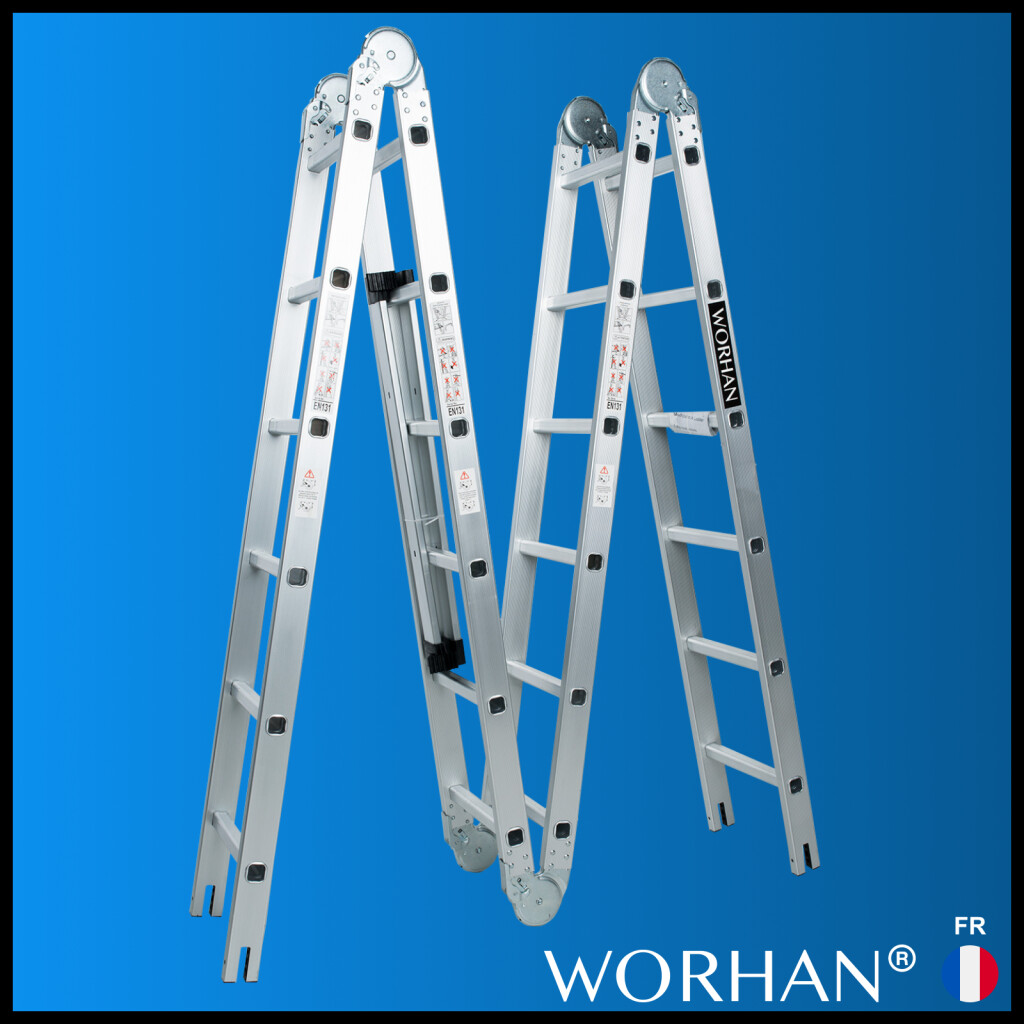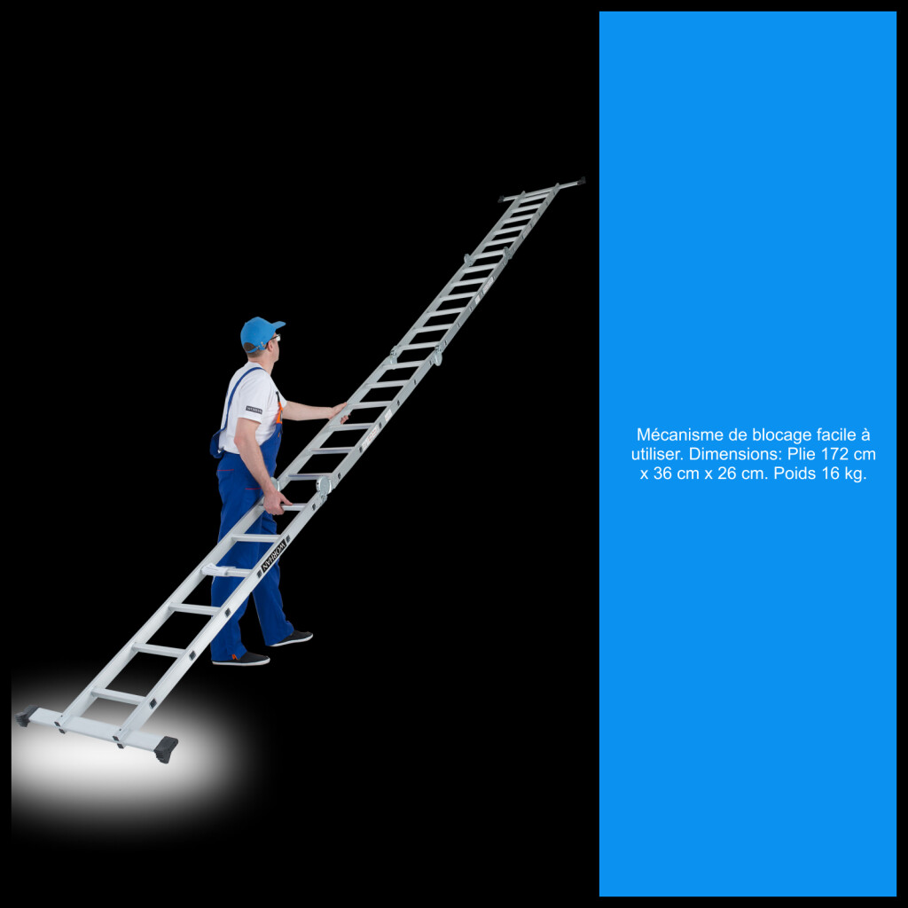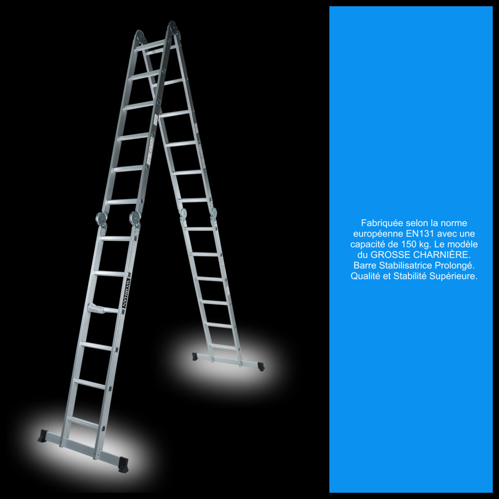 Fabriqué strictement aux normes de sécurité EN131., Matériaux: Aluminium anodisé., Poids maximal: 150kg., Echelons spéciaux antidérapants striés., Mécanisme de verrouillage facile à utiliser.