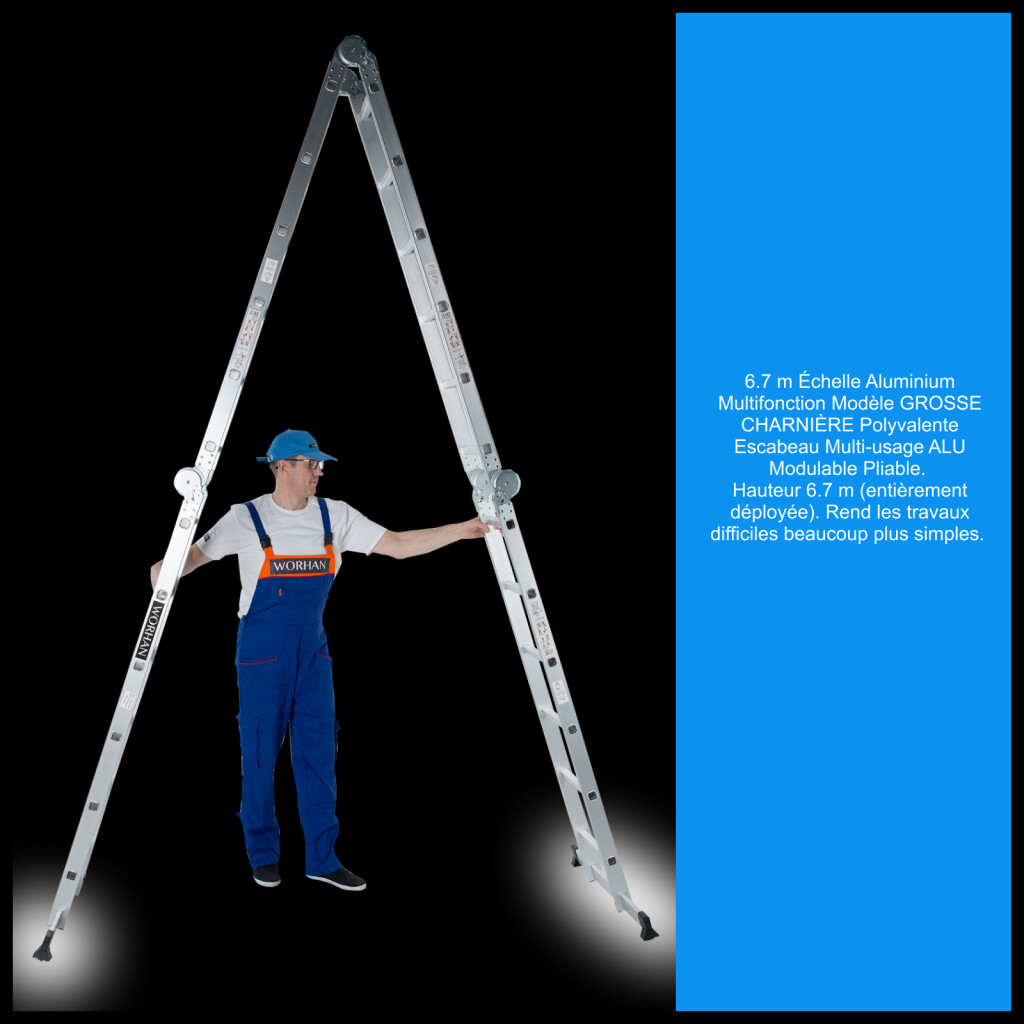 Le grand modèle de charnière., barre stabilisatrice étendue., Qualité et Stabilité Supérieure., Échelles très durables ont été fabriquées à partir d'aluminium de haute qualité., Mécanisme de blocage ajoutant une sécurité supplémentaire et de la rigidité à l'échelle lors de son utilization.