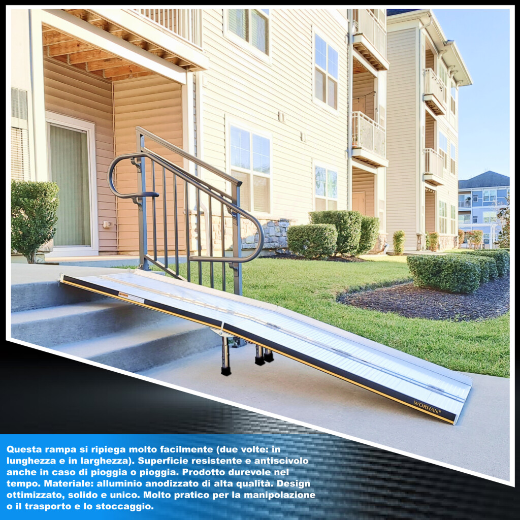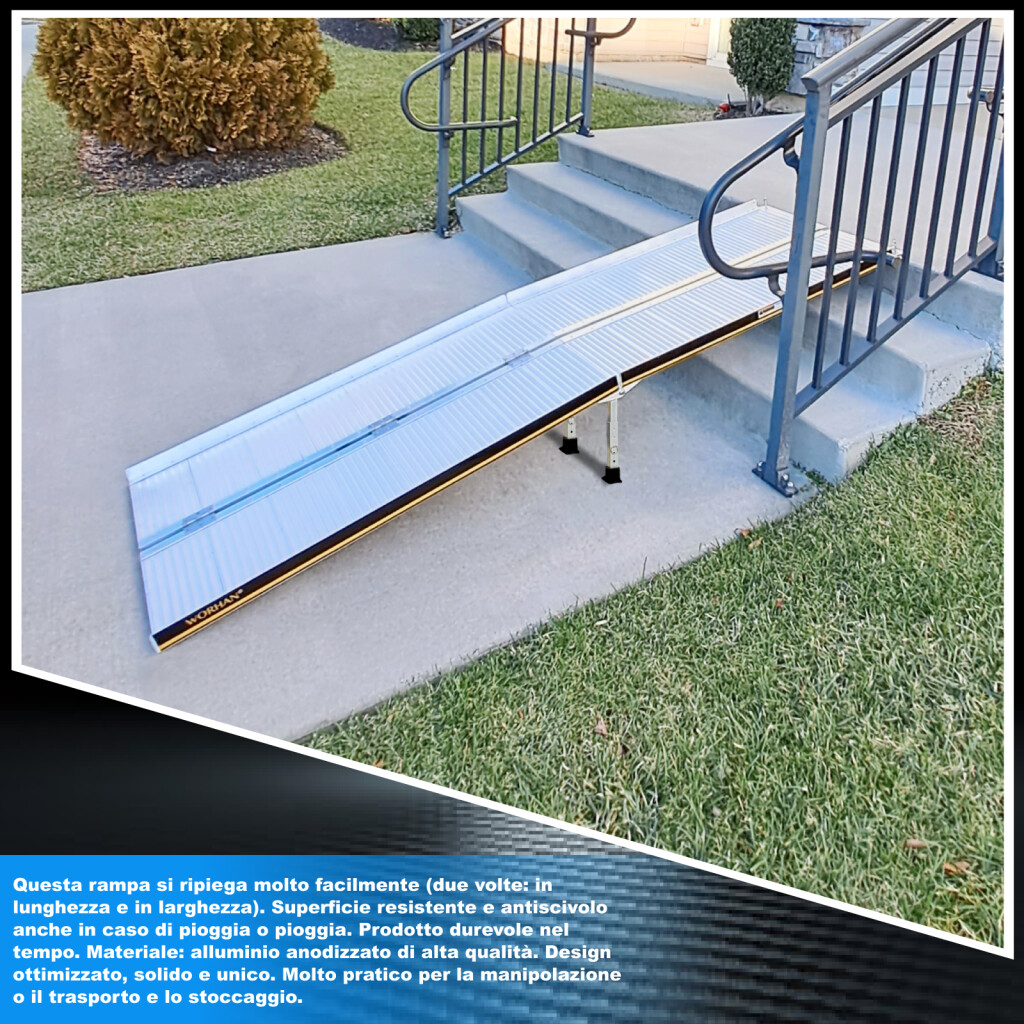 Questa rampa si ripiega molto facilmente (due volte: in lunghezza e in larghezza)., Superficie resistente e antiscivolo anche in caso di pioggia o pioggia., Prodotto durevole nel tempo., Materiale: alluminio anodizzato di alta qualità., Design ottimizzato, solido e unico. Molto pratico per la manipolazione o il trasporto e lo stoccaggio.