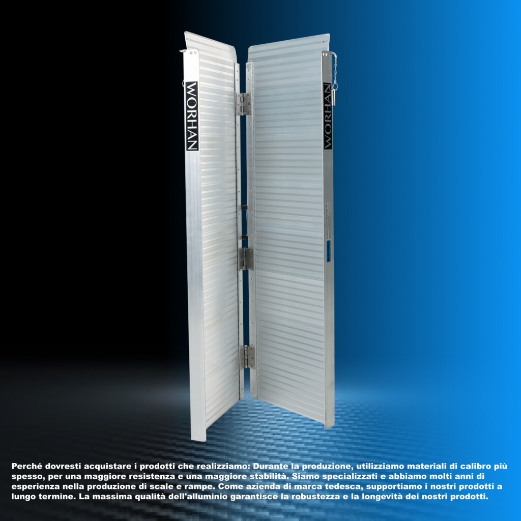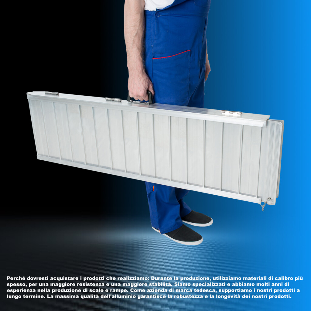 Perché dovresti acquistare i prodotti che realizziamo: Durante la produzione, utilizziamo materiali di calibro più spesso, per una maggiore resistenza e una maggiore stabilità., Siamo specializzati e abbiamo molti anni di esperienza nella produzione di scale e rampe., Come azienda di marca tedesca, supportiamo i nostri prodotti a lungo termine.La massima qualità dell'alluminio garantisce la robustezza e la longevità dei nostri prodotti.