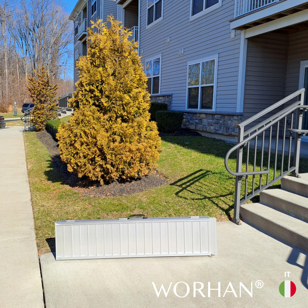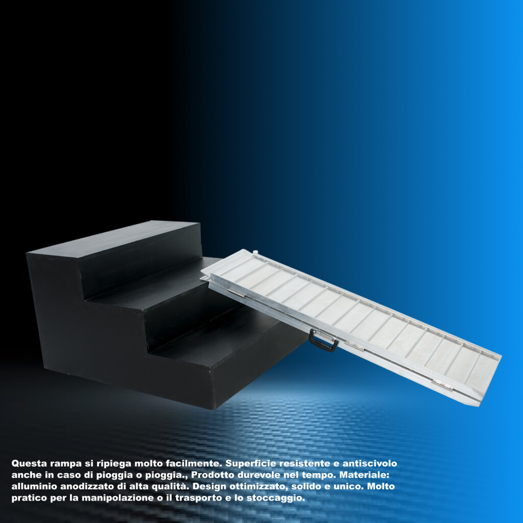 Questa rampa si ripiega molto facilmente., Superficie resistente e antiscivolo anche in caso di pioggia o pioggia., Prodotto durevole nel tempo., Materiale: alluminio anodizzato di alta qualità., Design ottimizzato, solido e unico. Molto pratico per la manipolazione o il trasporto e lo stoccaggio.