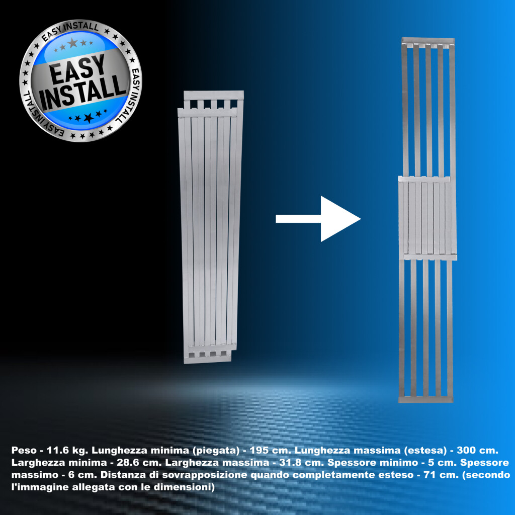 Il prodotto è realizzato in alluminio di alta qualità secondo gli standard EN e CE. Design del profilo in alluminio ad incastro per sostenere un peso fino a 300 kg!!! Aratterizzato da 3 maniglie robuste e una superficie incisa antiscivolo per una presa ottimale. Peso - 11,6 kg., Lunghezza minima (piegato) - 195 cm., Lunghezza massima (esteso) - 300 cm., Larghezza minima - 28,6 cm., Larghezza massima - 31,8 cm., Spessore minimo - 5 cm., Spessore massimo - 6 cm., Distanza di sovrapposizione quando completamente estesa - 71 cm. (secondo l'immagine allegata con le dimensioni) MARCHIO TEDESCO. SERVIZIO CLIENTI ECCEZIONALE. Installazione super veloce. Possibilità di distribuire e utilizzare la rampa a qualsiasi lunghezza compresa tra i valori di lunghezza minima e massima. Fermi di massima lunghezza integrati in alluminio. Perché dovresti acquistare i prodotti che produciamo: durante la produzione, utilizziamo materiali di calibro più spesso per una maggiore resistenza e una maggiore stabilità.Siamo specializzati e abbiamo molti anni di esperienza nella produzione di scale e rampe.Come azienda di marca tedesca, sosteniamo i nostri prodotti a lungo termine L'alluminio di altissima qualità garantisce la robustezza e la longevità dei nostri prodotti.