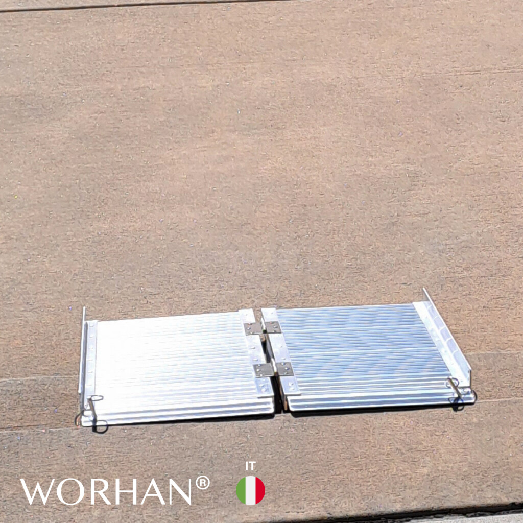 Questa rampa si ripiega molto facilmente., Superficie resistente e antiscivolo anche in caso di pioggia o pioggia., Prodotto durevole nel tempo., Materiale: alluminio anodizzato di alta qualità., Design ottimizzato, solido e unico. Molto pratico per la manipolazione o il trasporto e lo stoccaggio.