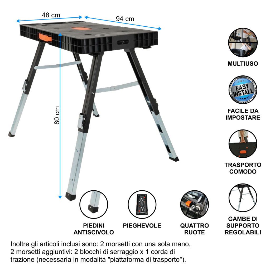 3 altezze di lavoro regolabili: a) 80cm., b) 66cm., ec) 52cm., Capacità di carico: 150kg, Peso: 15kg, Dimensioni aperte: 129cm x 59cm x 80cm, Dimensioni piegate: 94cm x 48cm x 16cm,