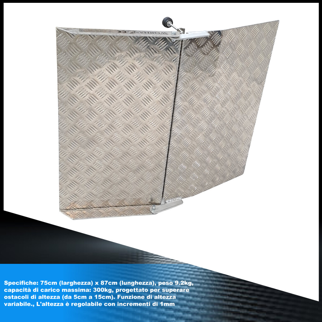 Questa rampa facilita l'attraversamento di ostacoli come: soglie alte, cavi, tubi e altri luoghi che impediscono il movimento pratico di persone o merci., La funzione di altezza variabile (da 5cm a 15cm) facilita ogni compito., 2 set di le estensioni sono incluse. , Per un'altezza minima, la piattaforma deve essere utilizzata senza prolunghe., Prodotto secondo gli standard EN-131 e CE Specifiche: 75cm (larghezza) x 87cm (lunghezza), peso 9.2kg, capacità di carico massima: 300kg, progettato per superare ostacoli di altezza (da 5cm a 15cm). Funzione di altezza variabile., L'altezza è regolabile con incrementi di 1mm Non è richiesto alcun assemblaggio. Ideale per spostarsi comodamente su sedie a rotelle, scooter, carriole, ecc. Costruzione in alluminio anodizzato semplice e resistente che non arrugginisce. Facile da rimuovere se necessario. La superficie antiscivolo della rampa offre sicurezza agli utenti.
