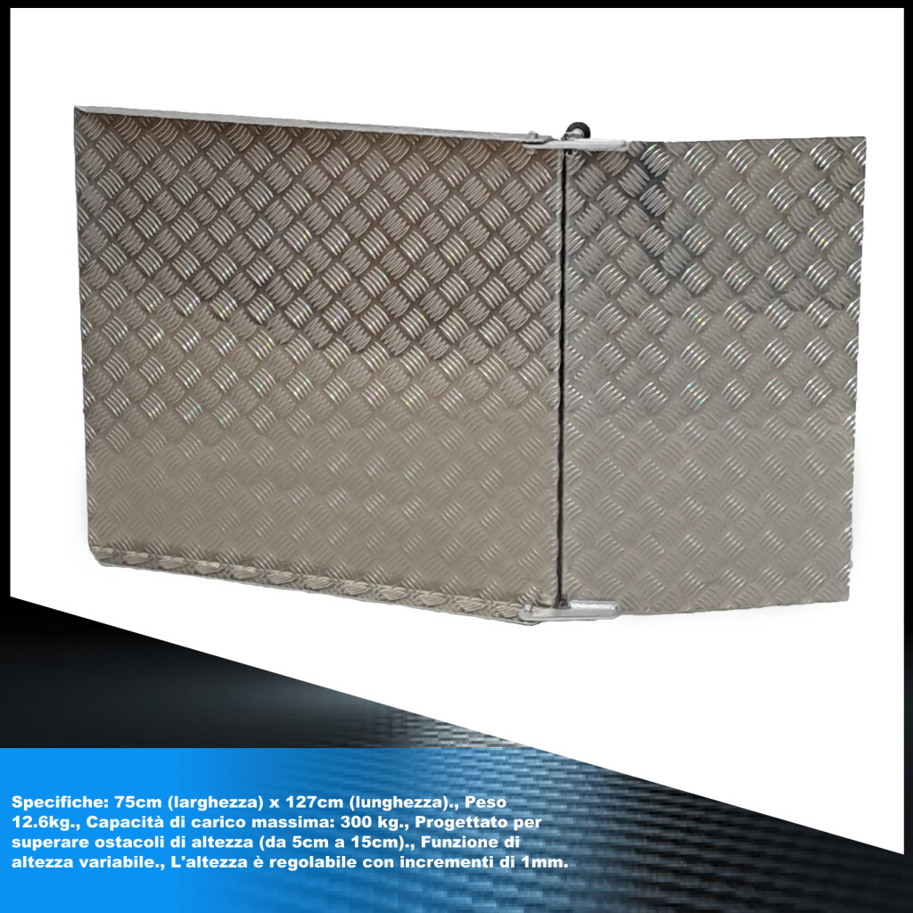Questa rampa facilita l'attraversamento di ostacoli come: soglie alte, cavi, tubi e altri luoghi che impediscono il movimento pratico di persone o merci., La funzione di altezza variabile (da 5cm a 15cm) facilita ogni compito., 2 set di le estensioni sono incluse., Per un'altezza minima, la piattaforma deve essere utilizzata senza estensioni., Prodotto secondo gli standard EN-131 e CE Specifiche: 75cm (larghezza) x 127cm (lunghezza)., Peso 12.6kg., Capacità di carico massima: 300 kg., Progettato per superare ostacoli di altezza (da 5cm a 15cm)., Funzione di altezza variabile., L'altezza è regolabile con incrementi di 1mm. Non è richiesto alcun assemblaggio. Ideale per spostarsi comodamente su sedie a rotelle, scooter, carriole, ecc. Costruzione in alluminio anodizzato semplice e resistente che non arrugginisce. Facile da rimuovere se necessario. La superficie antiscivolo della rampa offre sicurezza agli utenti.