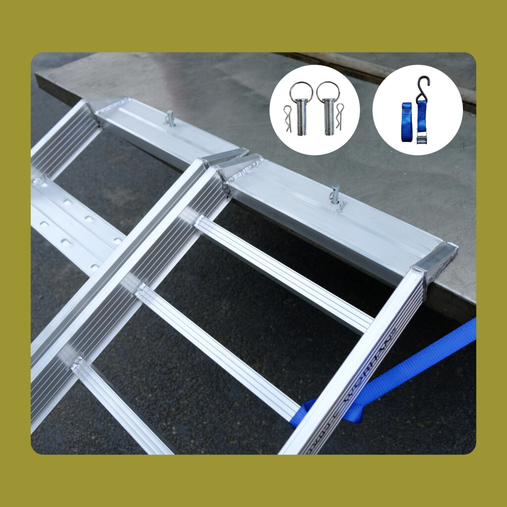 Un prodotto davvero unico e di alta qualità, che ti permette di camminare accanto alla tua moto durante le operazioni di carico o scarico. Questo prodotto è stato sviluppato per garantire la sicurezza della persona ed eliminare i possibili danni alla moto durante la fase di carico/scarico. La rampa è pieghevole in lunghezza ed è dotata di comoda maniglia per facilitare il trasporto. Le dimensioni del prodotto piegato sono: 180cm x 38cm x 16cm., Peso: 11.5kg., Carico massimo: 500kg Dettagli tecnici: Lunghezza: 180cm., Larghezza (aperto): 77cm., Peso: 11.5 kg., Spessore rampa / Profondità: 7.6cm., Distanza tra i gradini (da centro a centro del gradino): 30cm., Profondità del gradino: 11cm., distanza per i pioli di guida della moto: 15.5cm., La rampa è progettata per sostenere un peso di 500kg (questo è il peso totale combinato della persona e della moto). Procedure di saldatura di alta precisione e qualità garantiscono la longevità del prodotto. Precauzioni di sicurezza e caratteristiche di ancoraggio: Questa rampa può essere fissata contro lo scivolamento tramite: a) cinghia (in dotazione) oppure utilizzando b) coppie di perni metallici che impediscono lo scorrimento della parte superiore della rampa. Quando si preferisce l'opzione ''b)'', a seconda della situazione, potrebbe essere necessario praticare 2 fori nella superficie di appoggio per l'inserimento dei perni metallici di bloccaggio. La superficie della rampa è antiscivolo, adatta per essere utilizzata in condizioni di tempo umido.